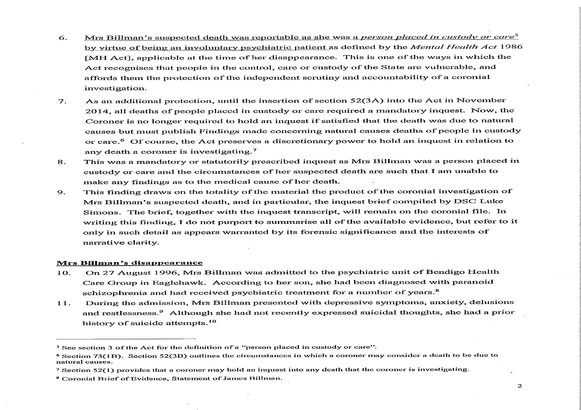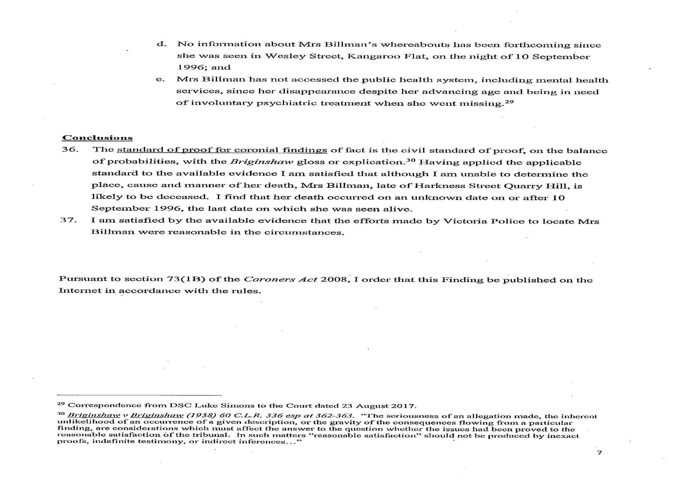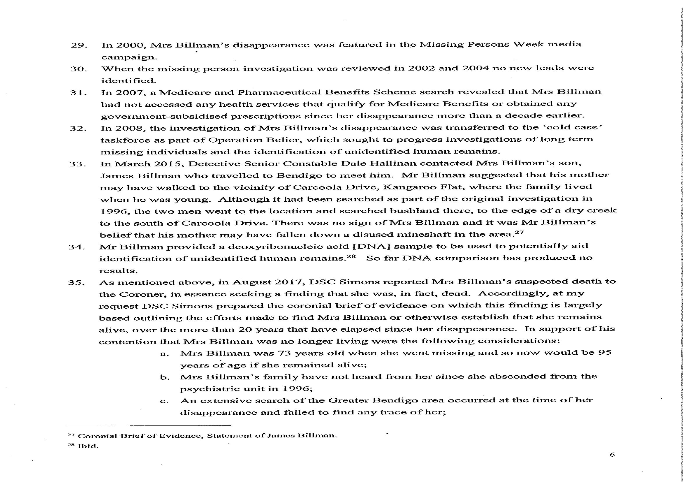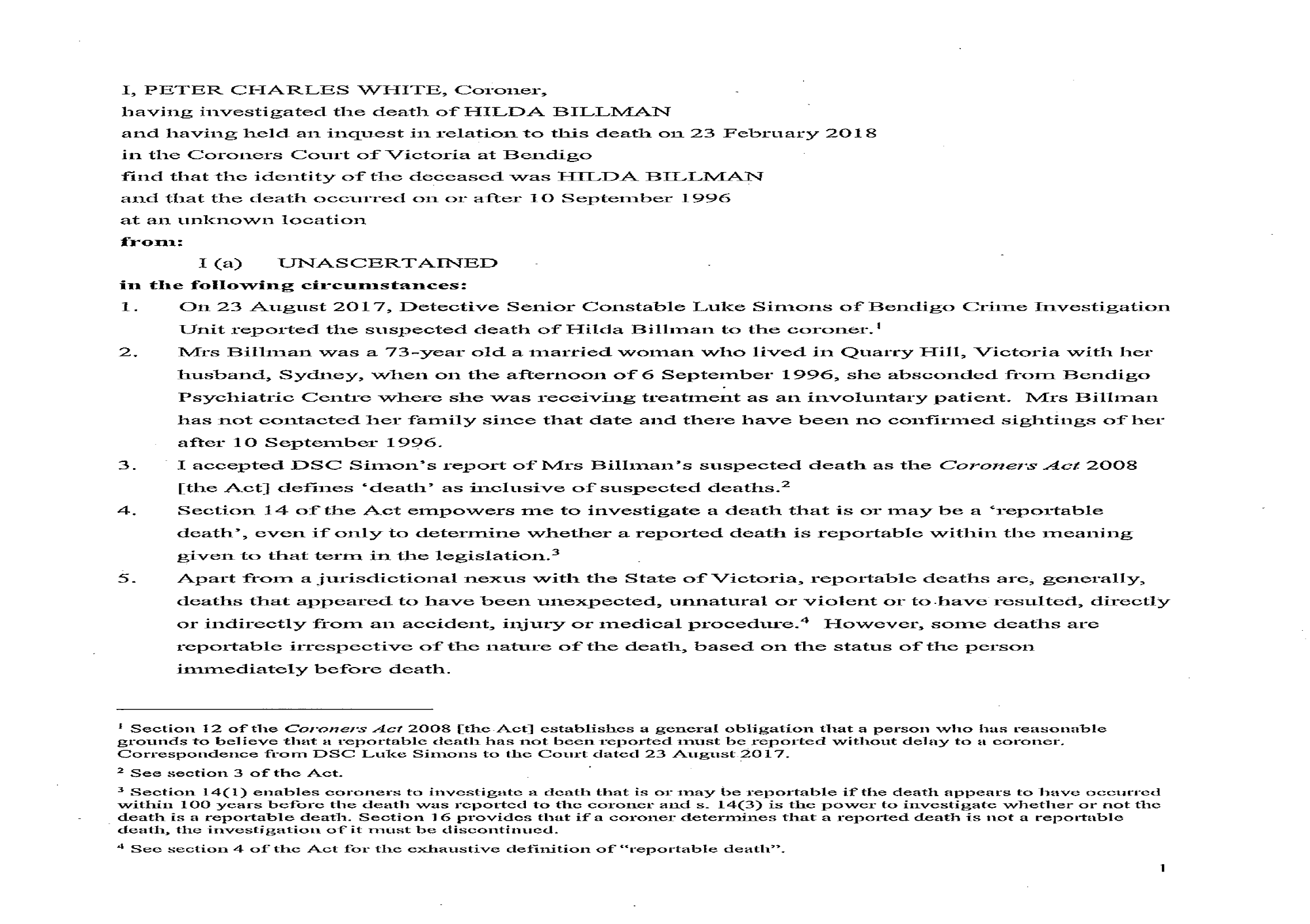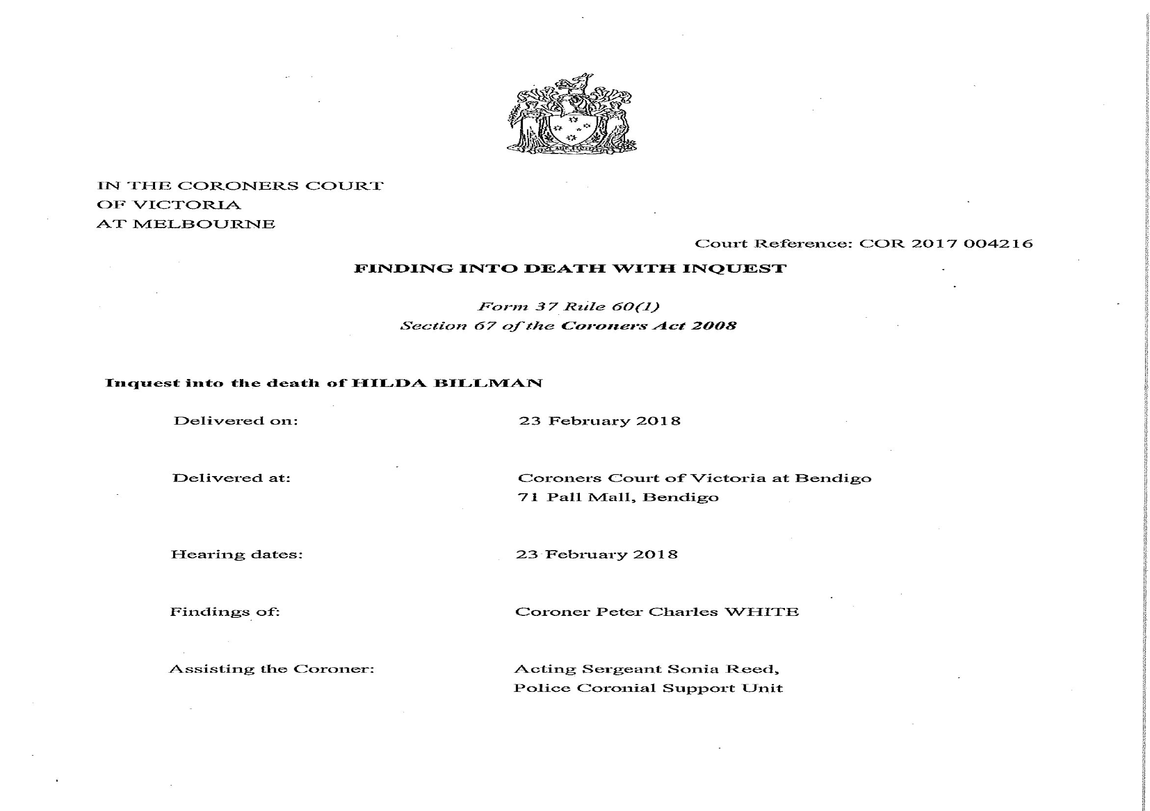 Coroner White reached the conclusion based on the fact Mrs Billman, who would now be 95 years of age, had not accessed the public health system since her disappearance, and police had received no information on her whereabouts since 1996.