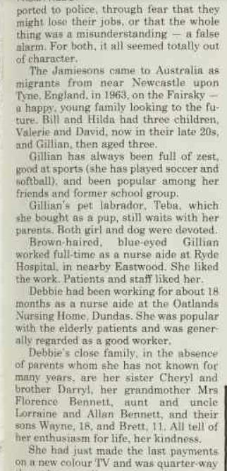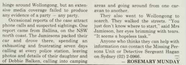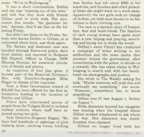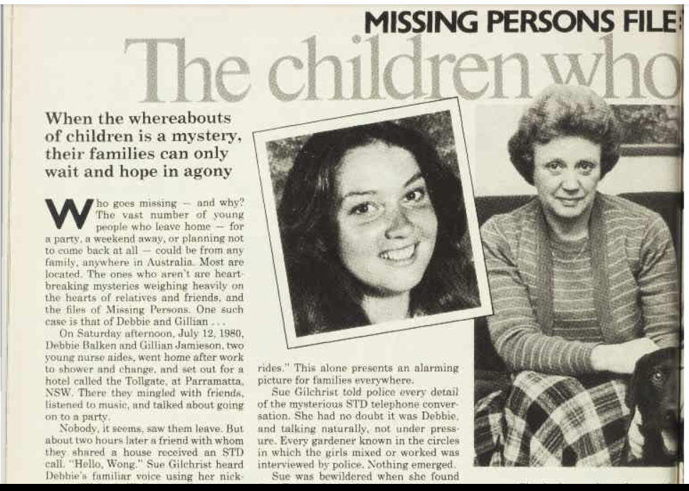 ON the 12th July 1980, Deborah Susan BALKEN and Gillian Janine JAMIESON, both aged 20 years, were last seen at the Tollgate Hotel, Parramatta. It is believed that both BALKEN and JAMIESON have met with foul play and are now deceased.