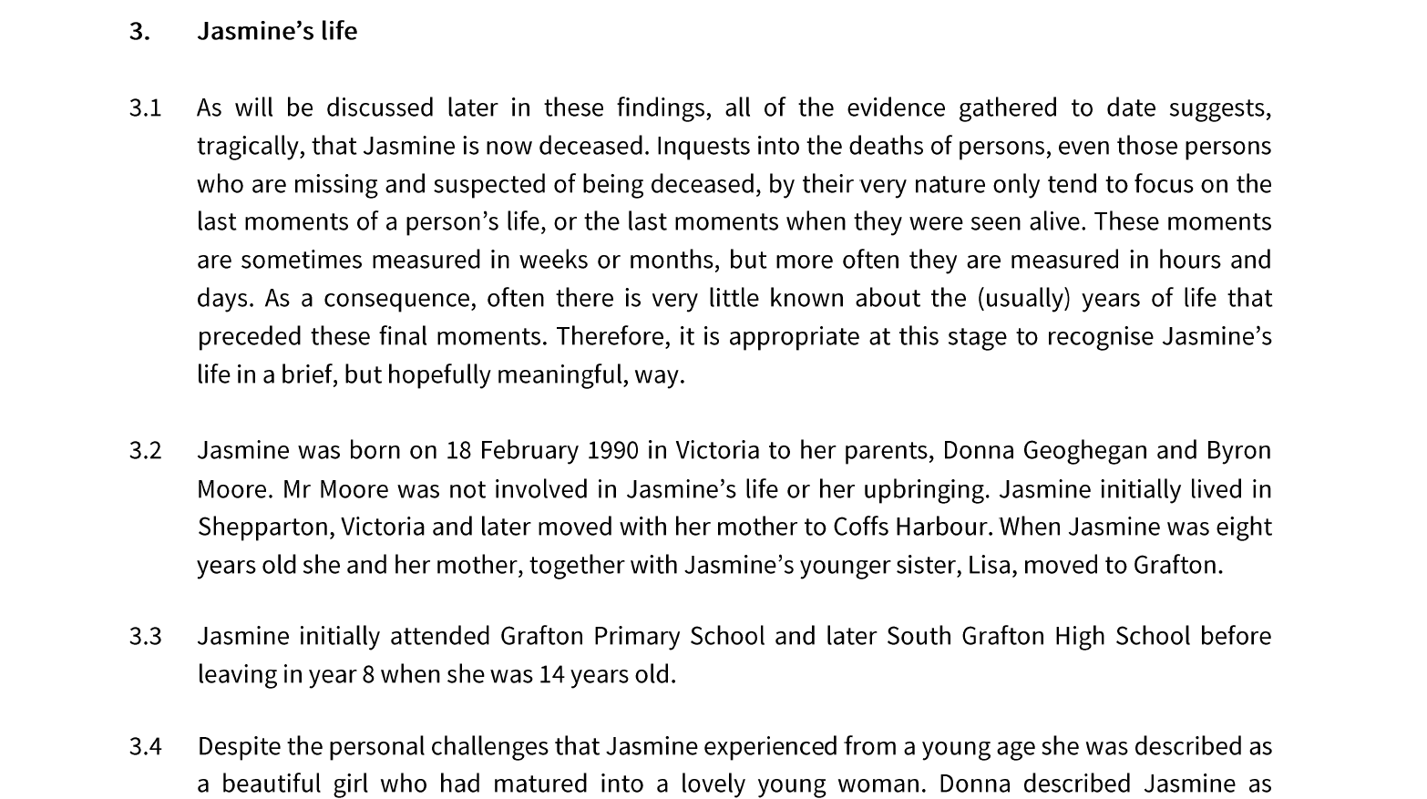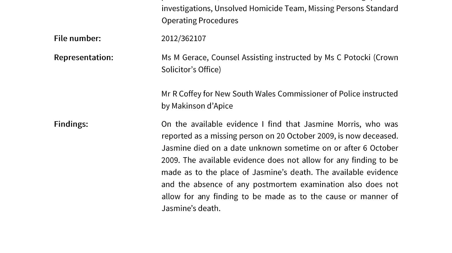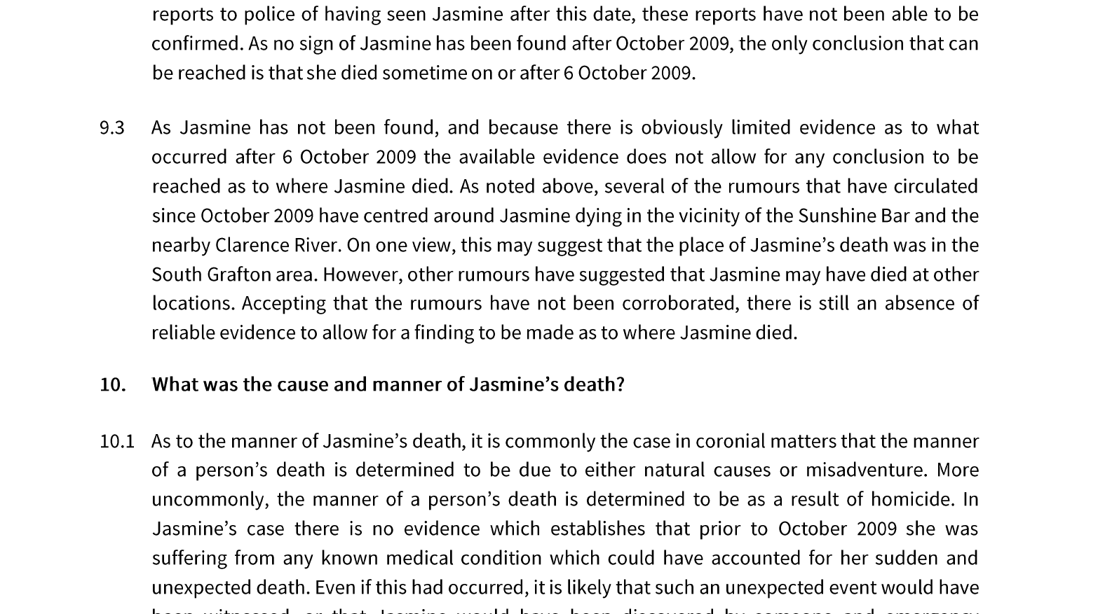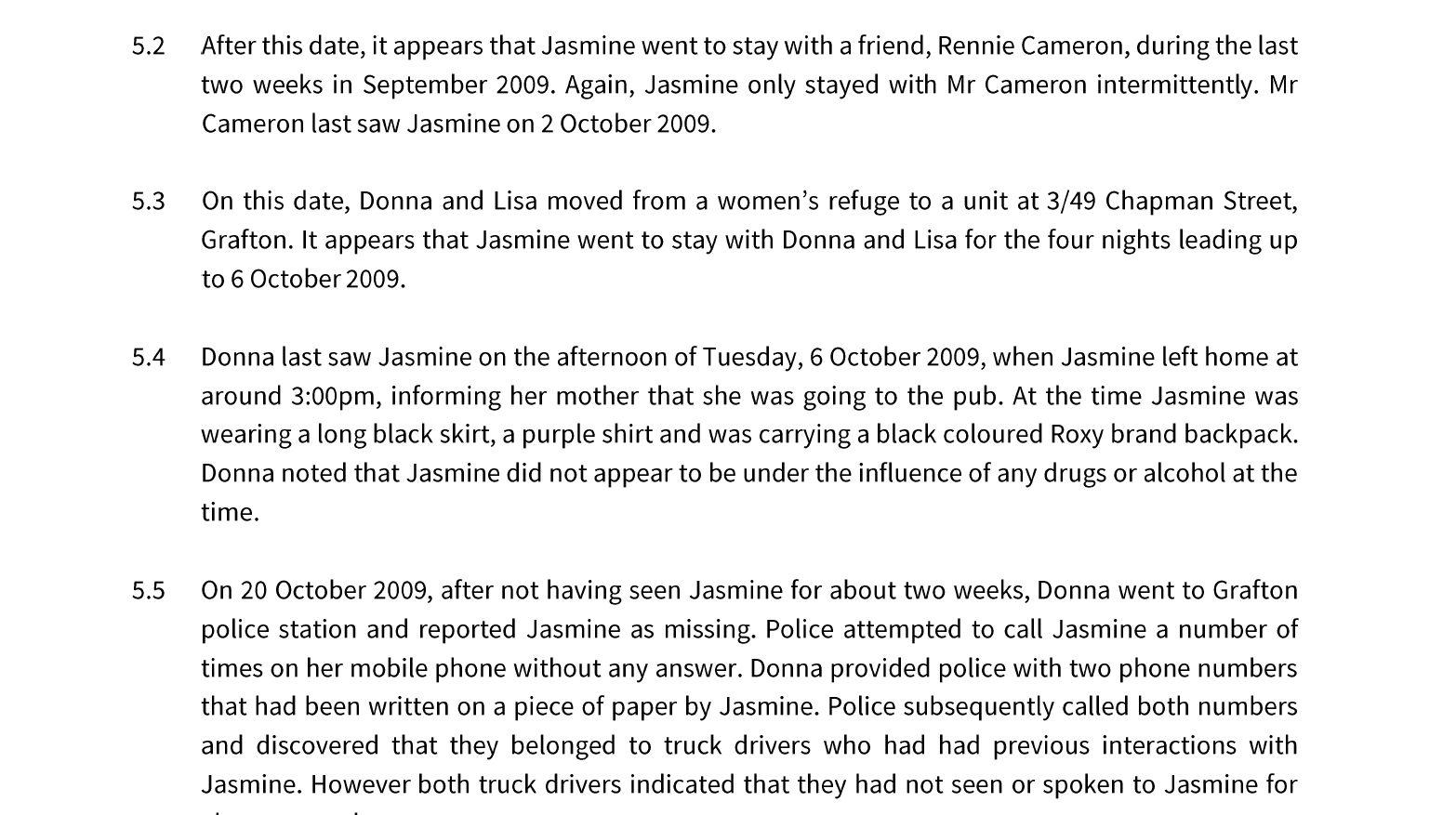 About 3pm on October 6, 2009, then 20-year-old Jasmine Morris, also known as Jasmine Moore, was last seen outside the Bi-Lo supermarket in South Grafton.
