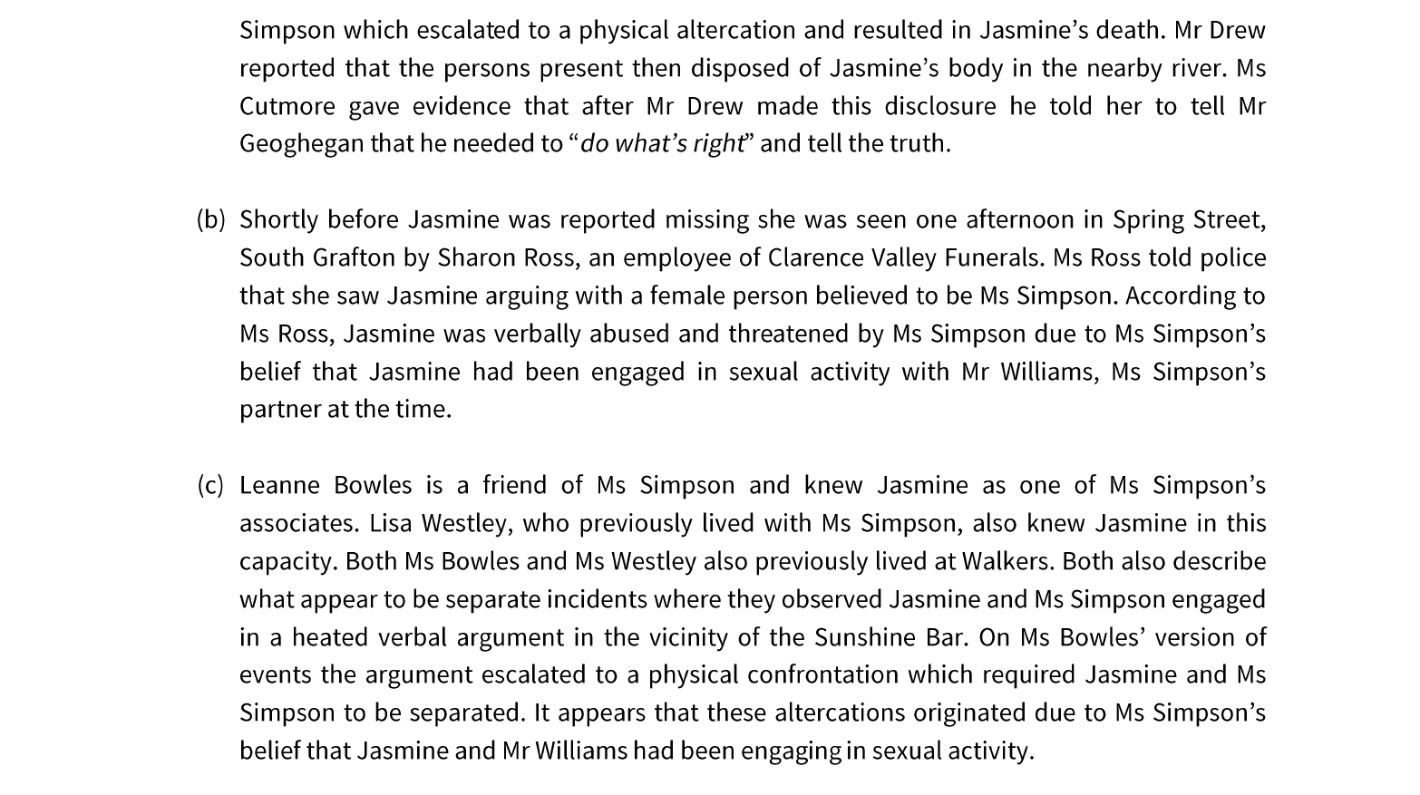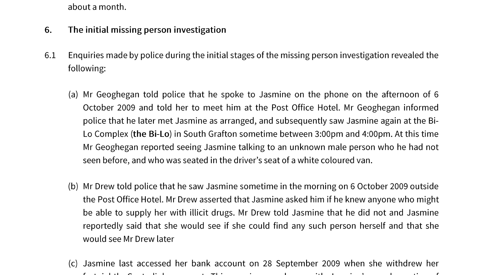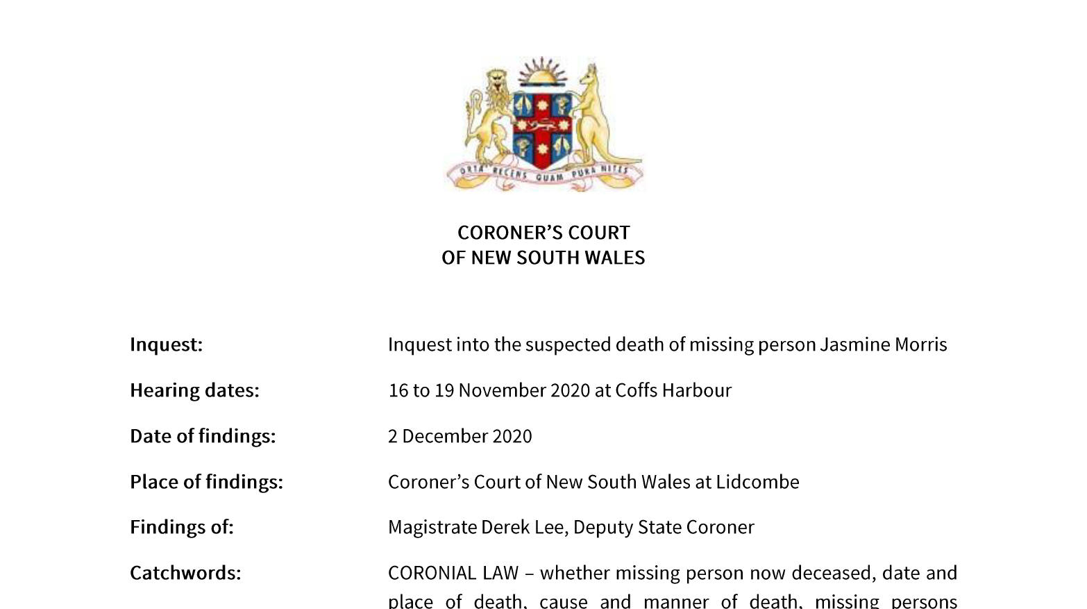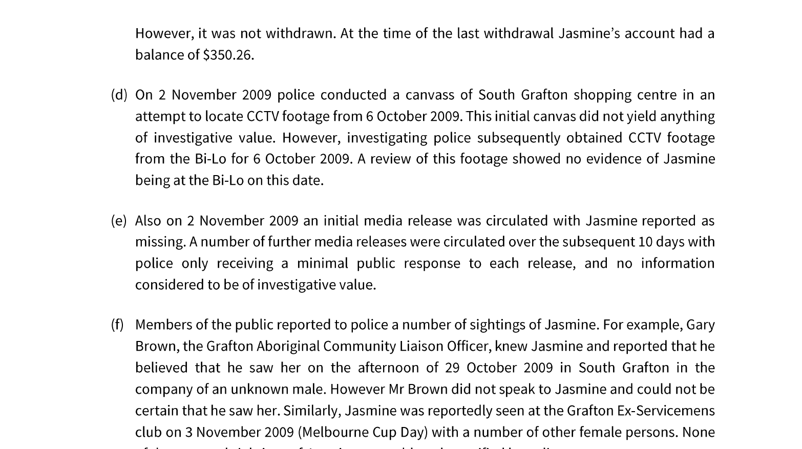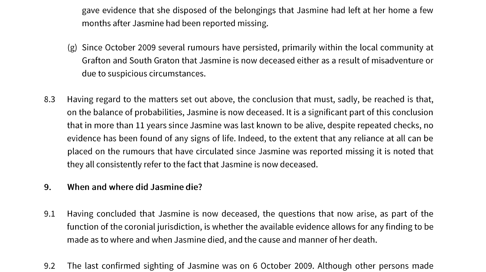 About 3pm on October 6, 2009, then 20-year-old Jasmine Morris, also known as Jasmine Moore, was last seen outside the Bi-Lo supermarket in South Grafton.