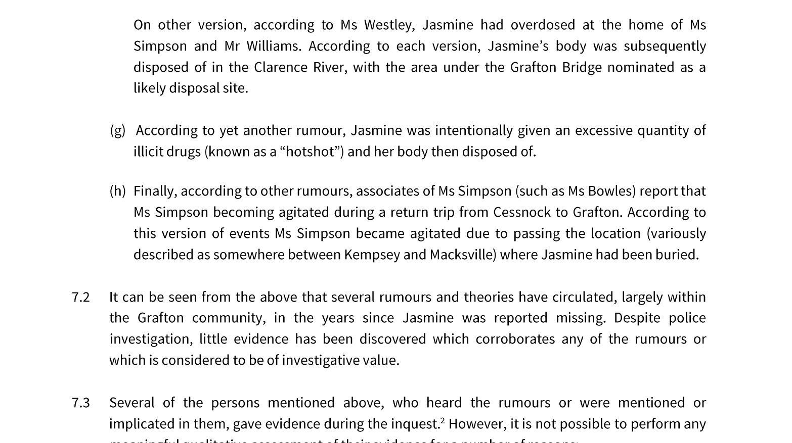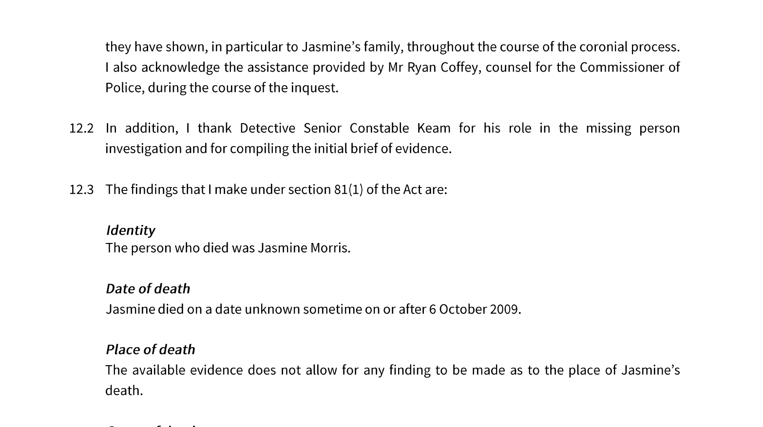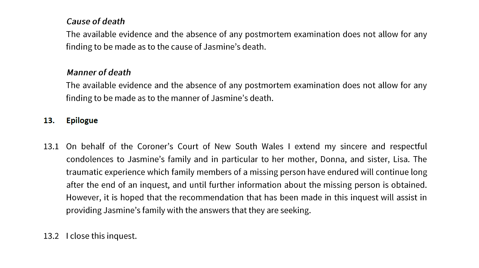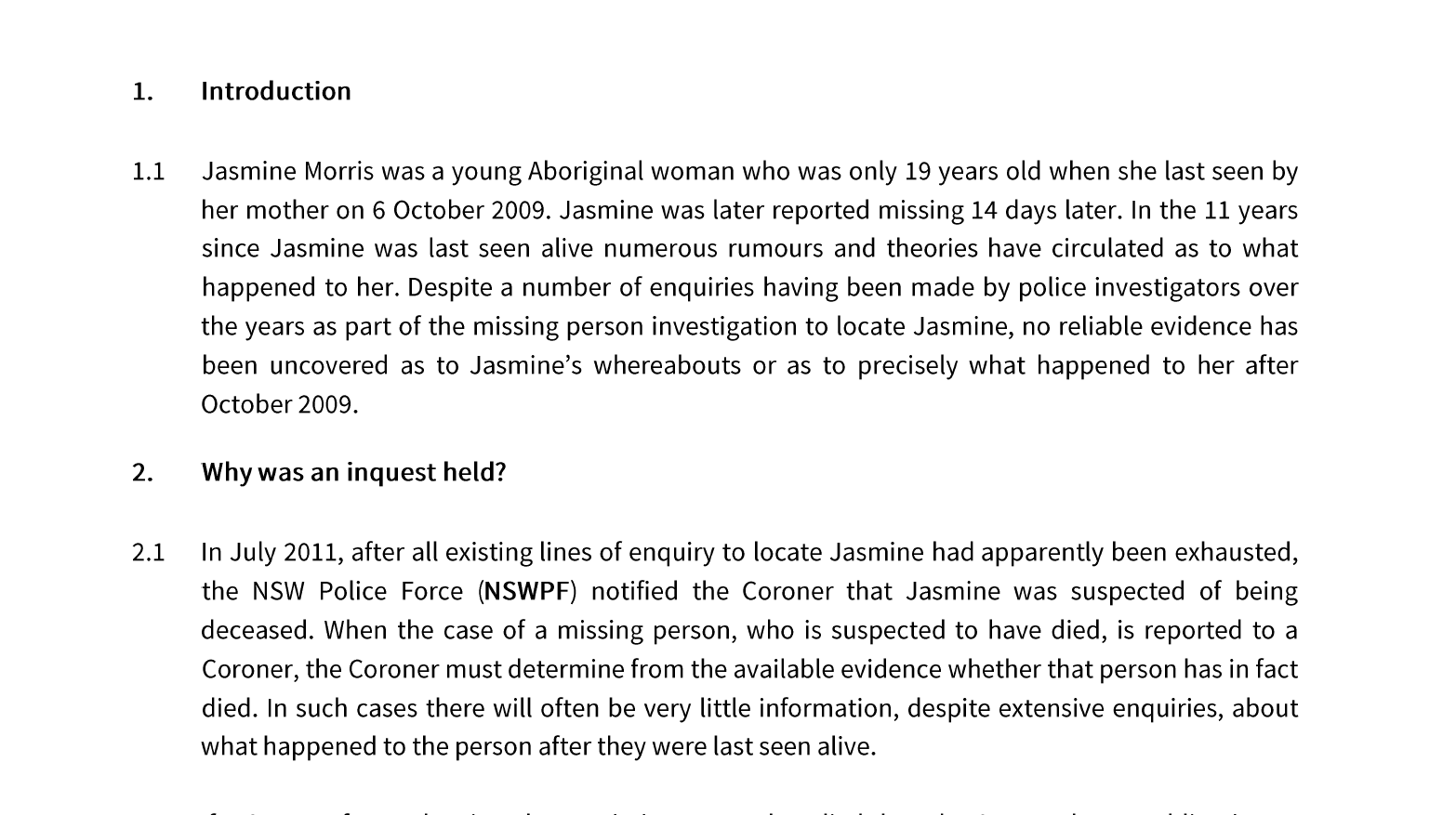 About 3pm on October 6, 2009, then 20-year-old Jasmine Morris, also known as Jasmine Moore, was last seen outside the Bi-Lo supermarket in South Grafton.