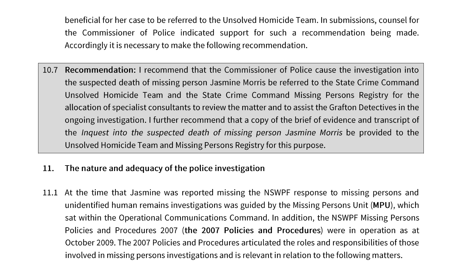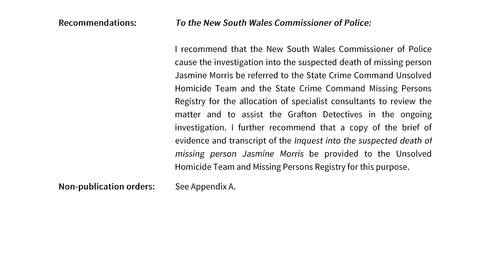 Despite extensive investigation by Grafton detectives, Ms Morris has not yet been found.