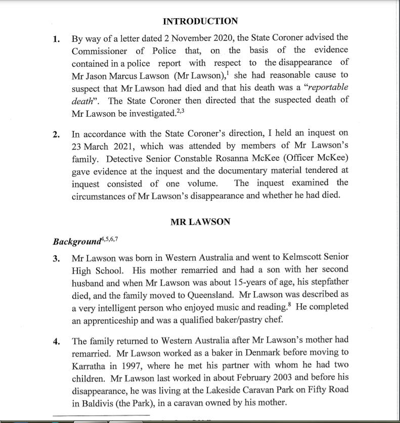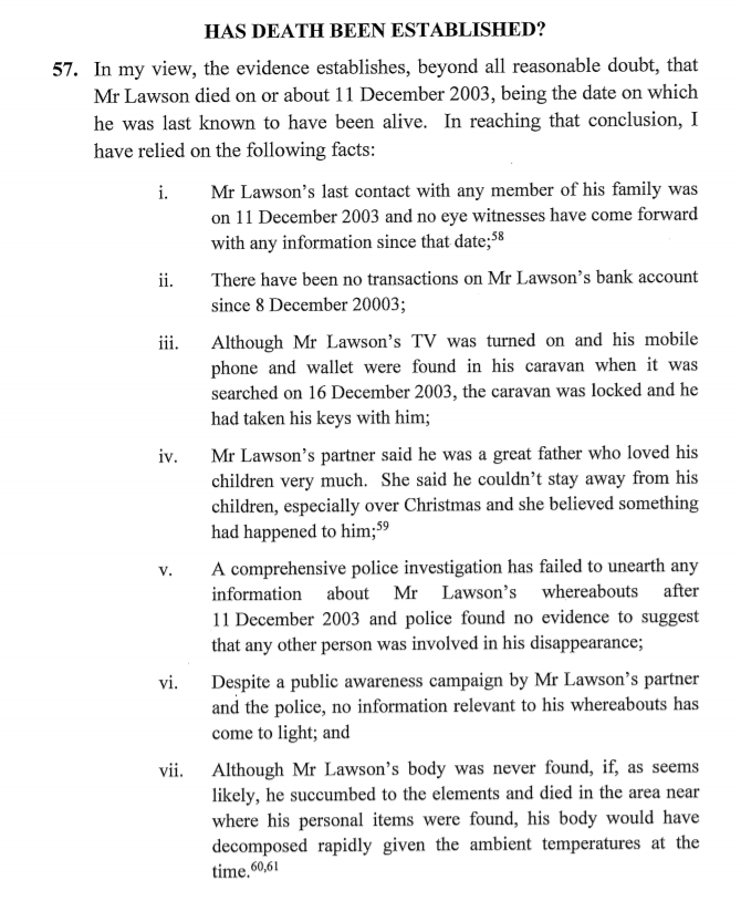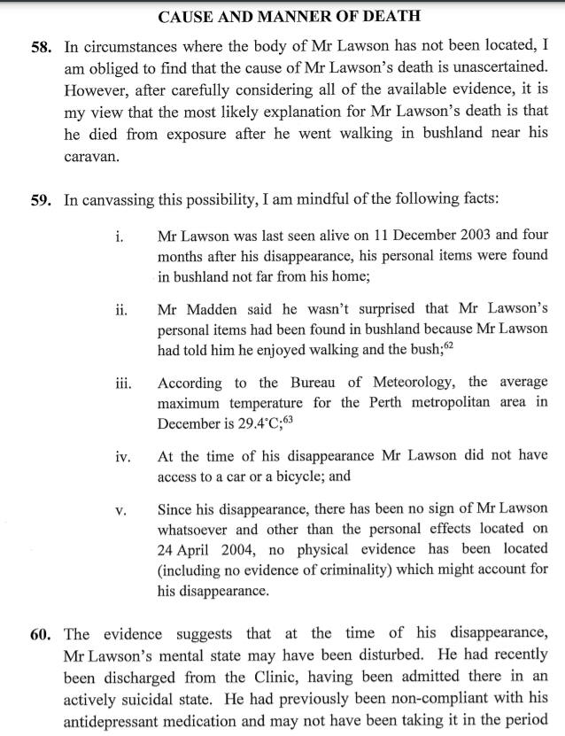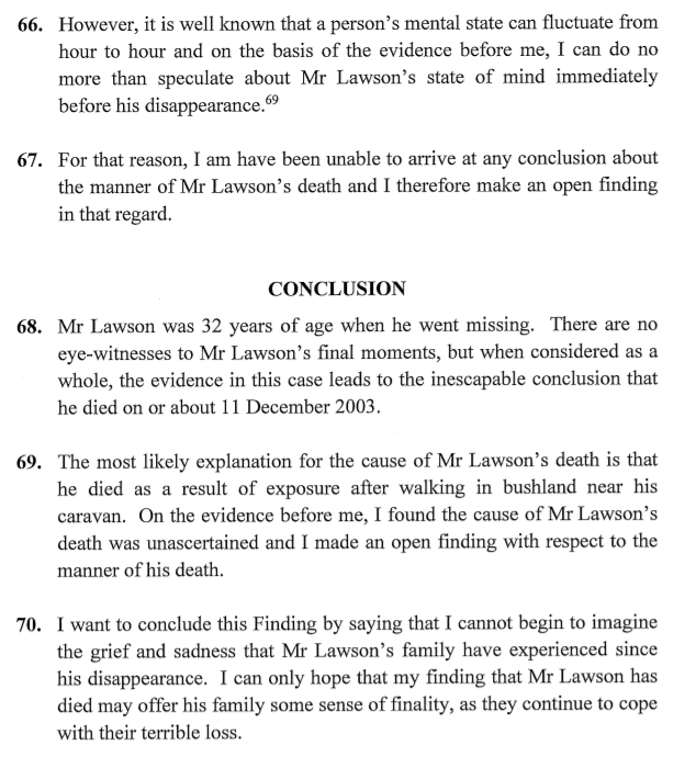 After considering all of the available evidence, the Coroner was satisfied beyond all reasonable doubt Mr Lawson was deceased. The Coroner was unable to determine how Mr Lawson died and made an Open Finding as to the manner of his death.