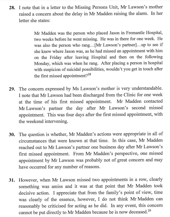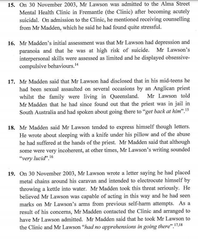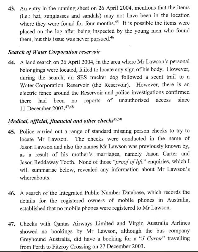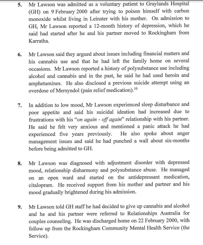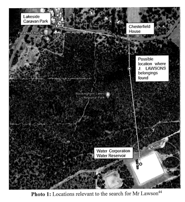 On 16 December 2003, a counsellor called Mr Lawson’s partner to advise that he had missed scheduled sessions on 12 and 14 December 2003. The partner became concerned for Mr Lawson’s welfare and went to the caravan park. There was no answer when she knocked on his caravan door and she rang his mother who attended and opened the door using a spare key. They found the television on and Mr Lawson’s belongings, including his wallet, mobile phone and medication, were in the caravan, although his keys were missing. There was no sign of Mr Lawson and they contacted police and reported him missing. They told police that Mr Lawson had recently been released from the Alma Street Mental Health Clinic in Fremantle where he had expressed suicidal thoughts and that he was taking antidepressant medication.