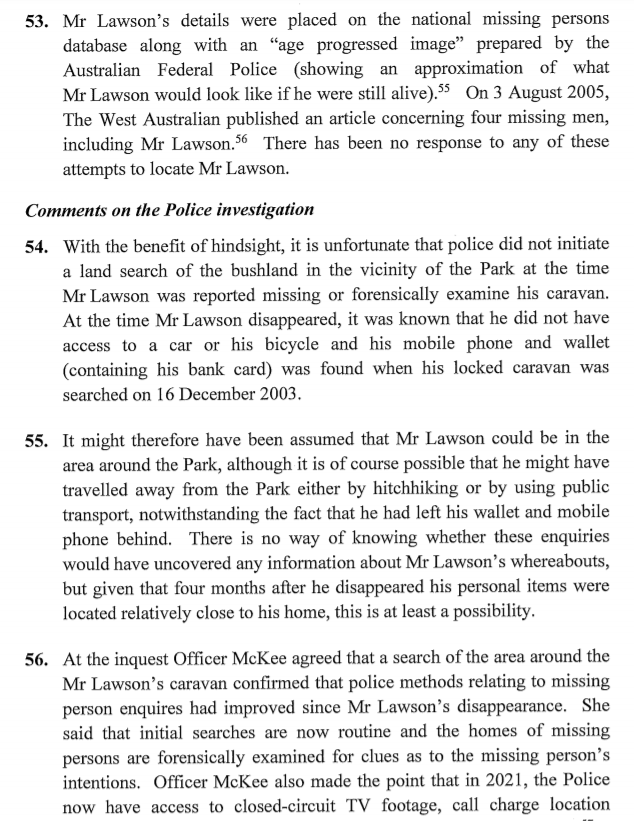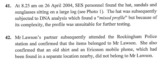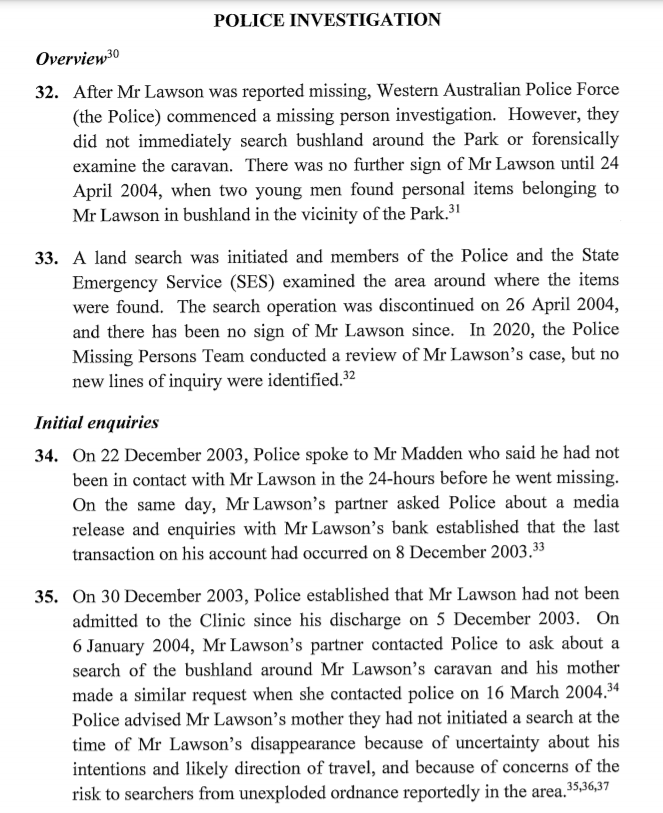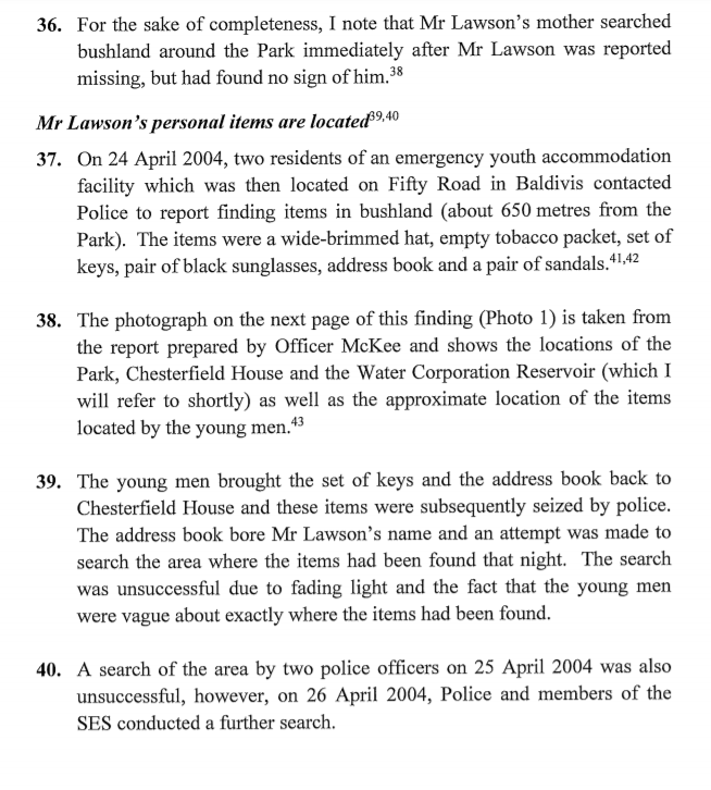 Police commenced a missing person investigation but did not immediately search bushland around the caravan park or conduct a forensic examination of the caravan. There was no further information about Mr Lawson’s whereabouts until 24 April 2004, when two young men found personal items belonging to Mr Lawson in bushland in the vicinity of the caravan park.