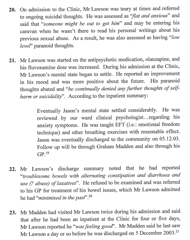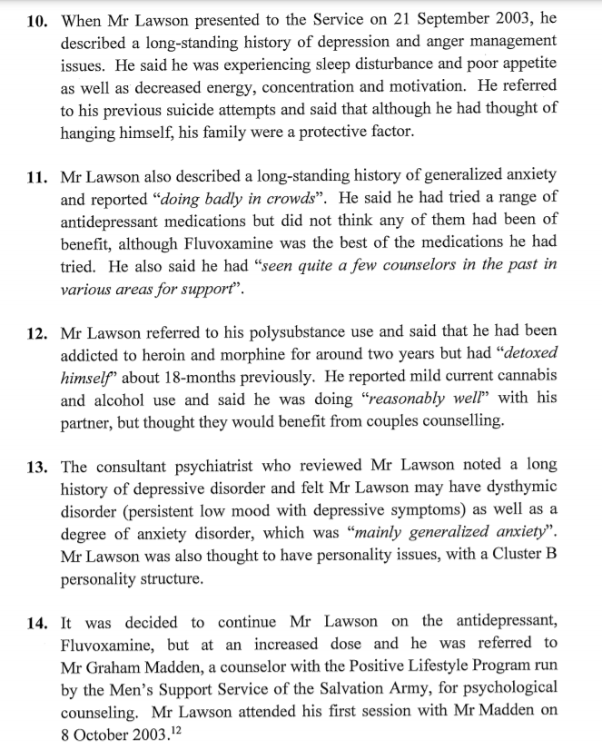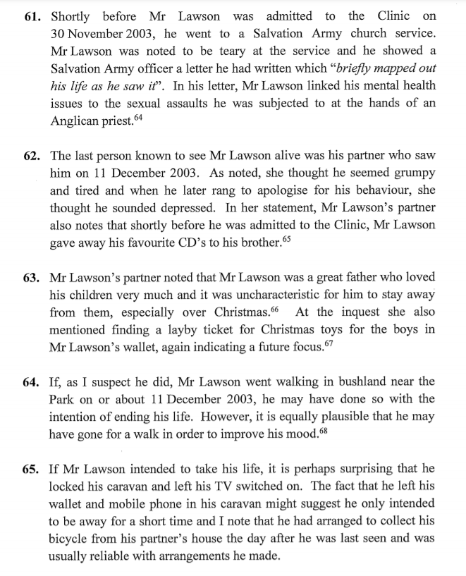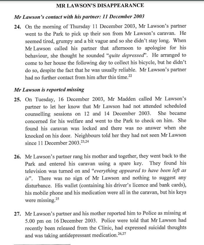 Mr Lawson’s partner last saw him on 11 December 2003, when she visited him to collect their son. She described Mr Lawson as grumpy and a bit vague and thought he seemed tired. Later that afternoon, Mr Lawson called his partner to apologise for his behaviour and during the call, she thought he sounded quite depressed. He made arrangements to collect his bicycle from her the following day and although he was usually reliable, he did not arrive. Neighbours later told police that they had not seen Mr Lawson since 11 December 2003.