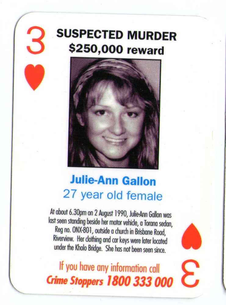 On Thursday, 2 August 1990, between 5.30pm and 6.00pm Julie-Ann Gallon, 27 years of age, left her place of employment at the Queensland Museum, intending to drive to her place of residence at Karrabin QLD. She was last seen at about 6.30pm on this date, standing beside her motor vehicle, a Torana sedan, registered number ONX-801, outside a Church situated at 35 Brisbane Road, Riverview.