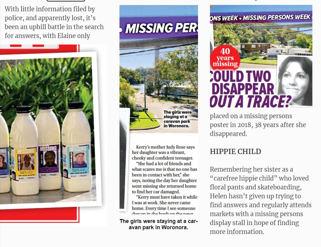 According to Australian Associated Press, Kerry, who may have been pregnant, was known to hitchhike as far afield as Wyong on the NSW Central Coast.