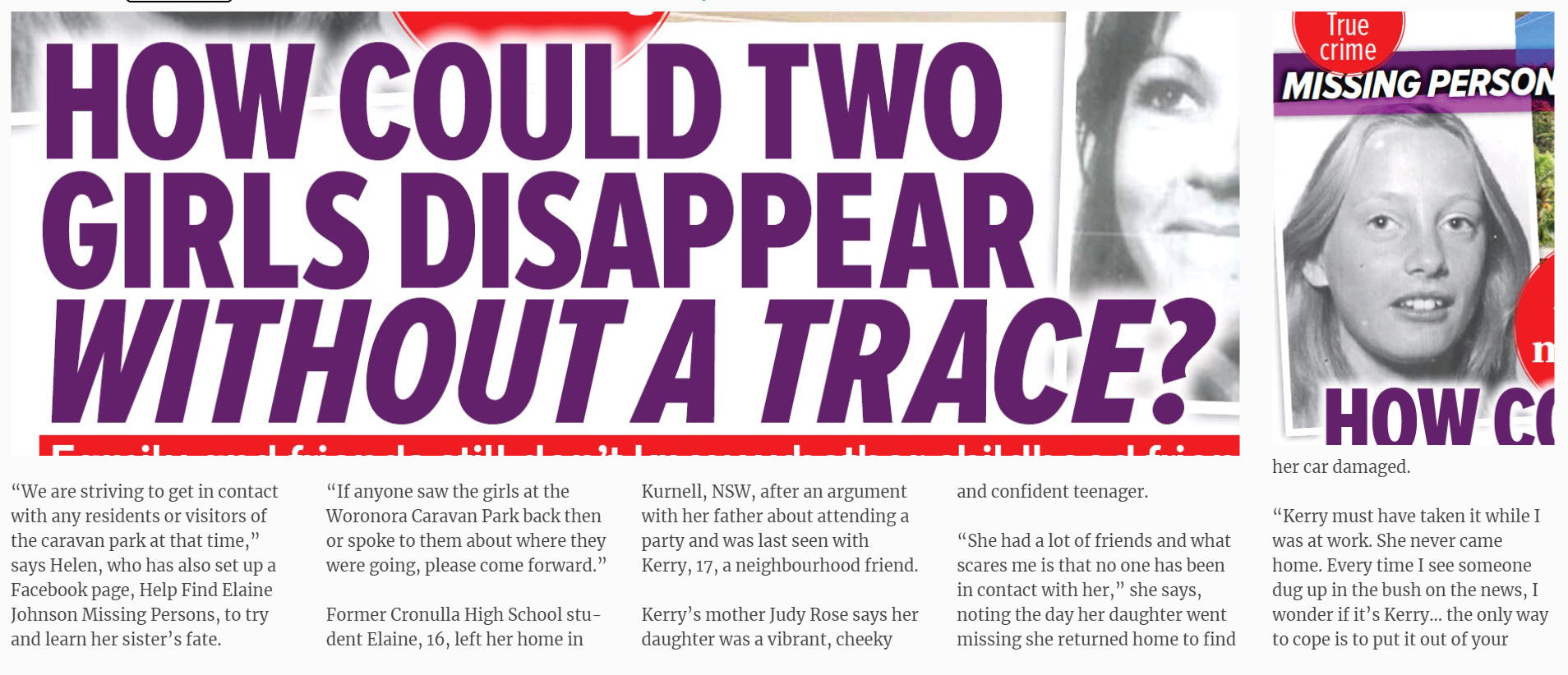 Cronulla girls Kerry Anne Joel, 18, and Elaine Johnson, 17, were believed to be hitchhiking to the Central Coast when they disappeared on February 1, 1980.