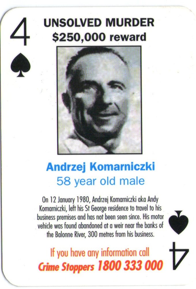 REWARD: The Minister for Police and Corrective Services has approved a reward of $250,000 be offered for information which leads to the apprehension and conviction of the person or persons responsible for the disappearance and suspected murder of Andrzej KOMARNICZKI at St George on 12 January 1980.