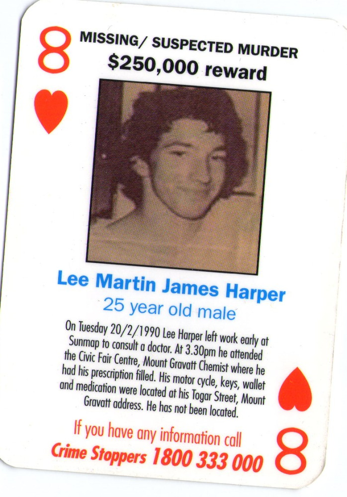 On Tuesday 20 February 1990 Lee Martin James Harper went to work at Sunmap as usual and left work early to consult a doctor. At 3.30pm on that date, Harper attended the Civic Fair Centre, Mount Gravatt where the last confirmed sighting of him was at the Chemist where he had his prescription filled after consulting the doctor. It is apparent that Harper went home to 35 Togar Street, Mount Gravatt, as his keys, motorcycle, wallet and the medication were located at this address. Harper to date has not been located and the circumstances of his disappearance lead to suspicion of foul play.