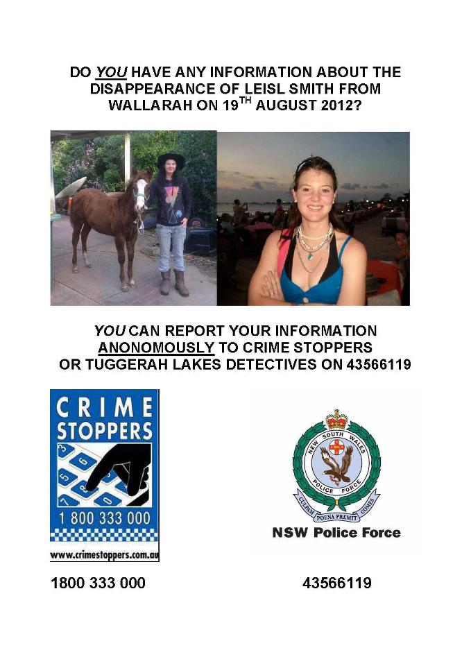 Leisl Smith, then aged 23, was last seen about 1pm on Sunday, August 19, 2012, leaving her Wallarah home.
