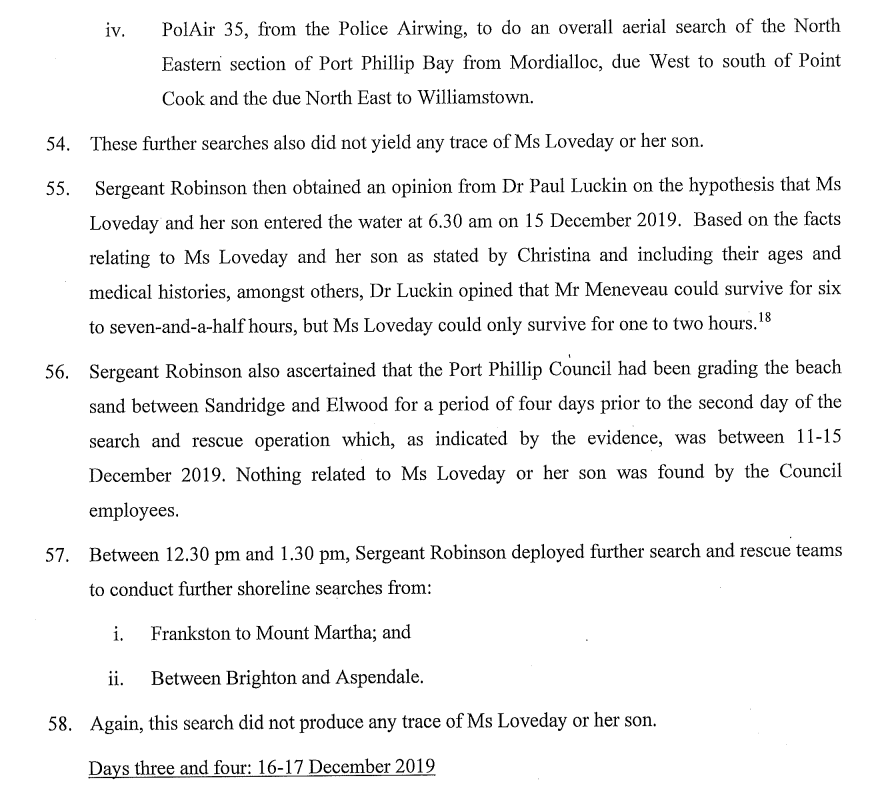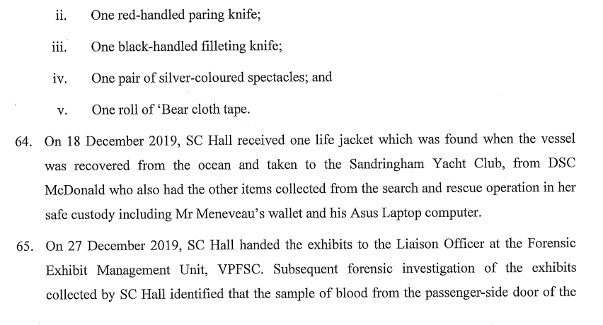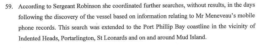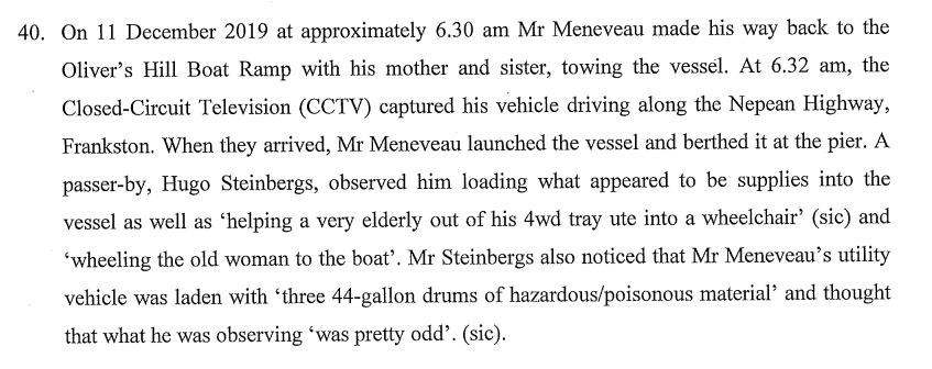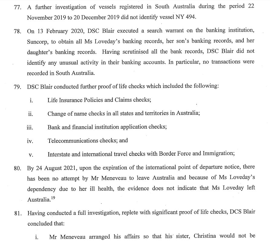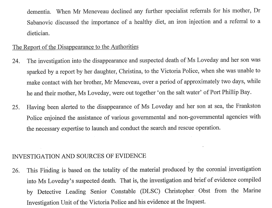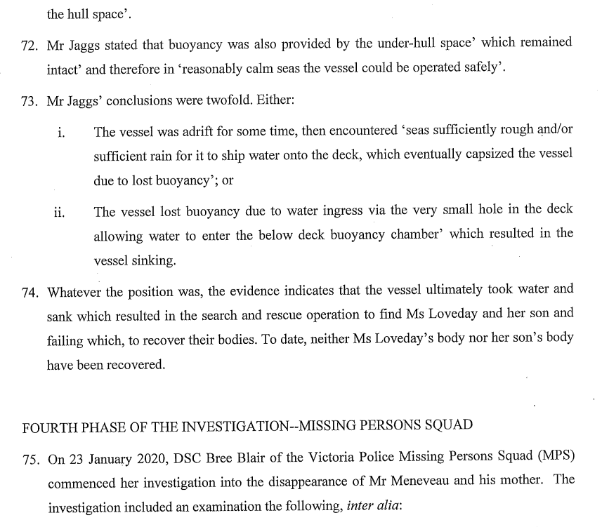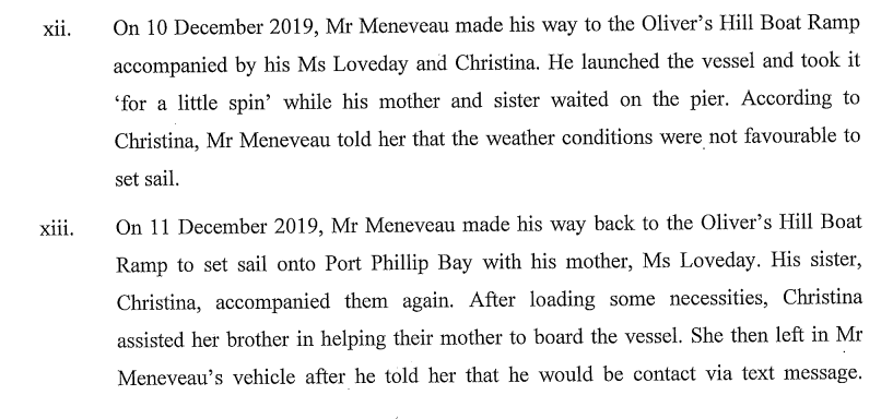 He was also suspicious about photos taken at the time of departure. It showed Ms Loveday seated in the front of the boat while Mr Meneveau dealt with supplies in the back. Both were wearing life vests.