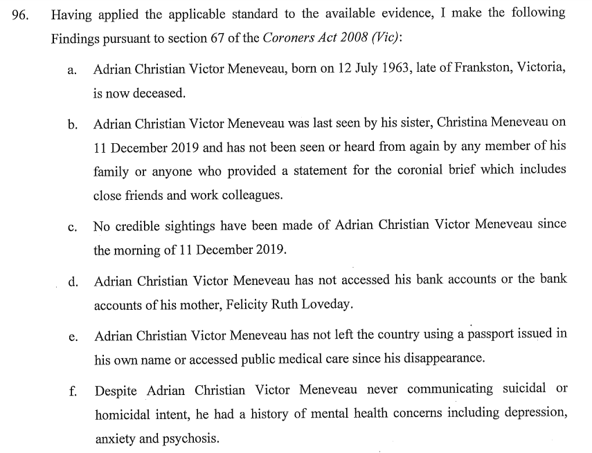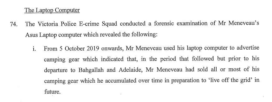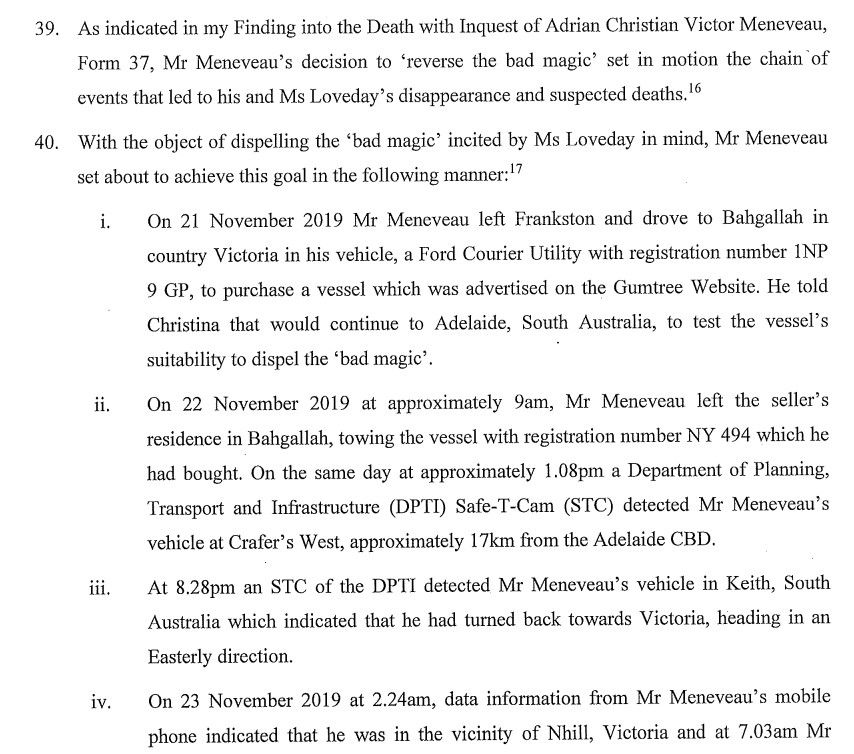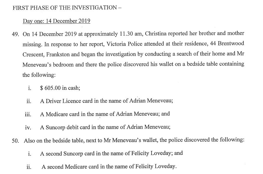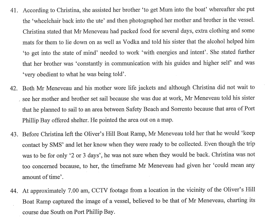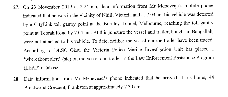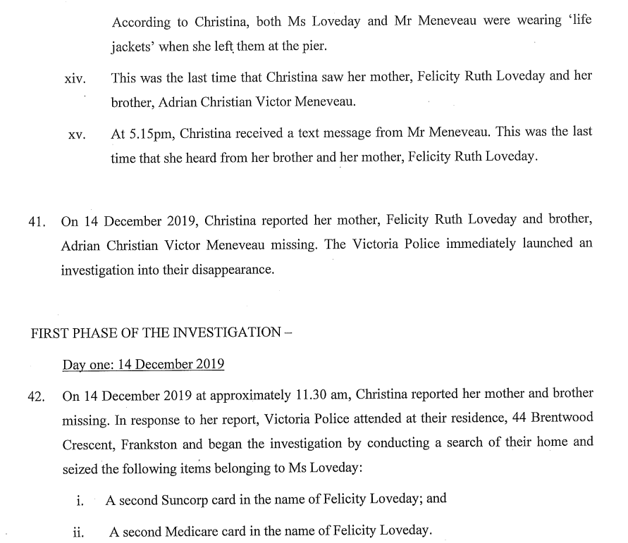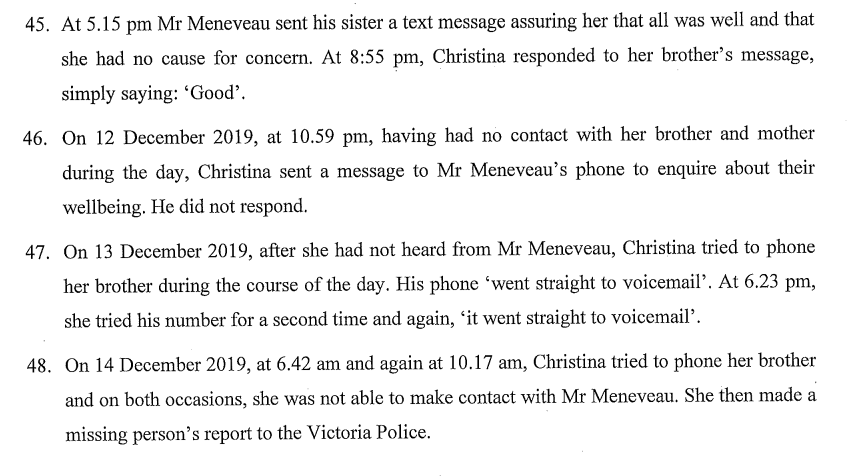 Mr Meneveau sent a text later in the afternoon advising all was well and that was the last contact. Ms Meneveau reported them missing on December 14.