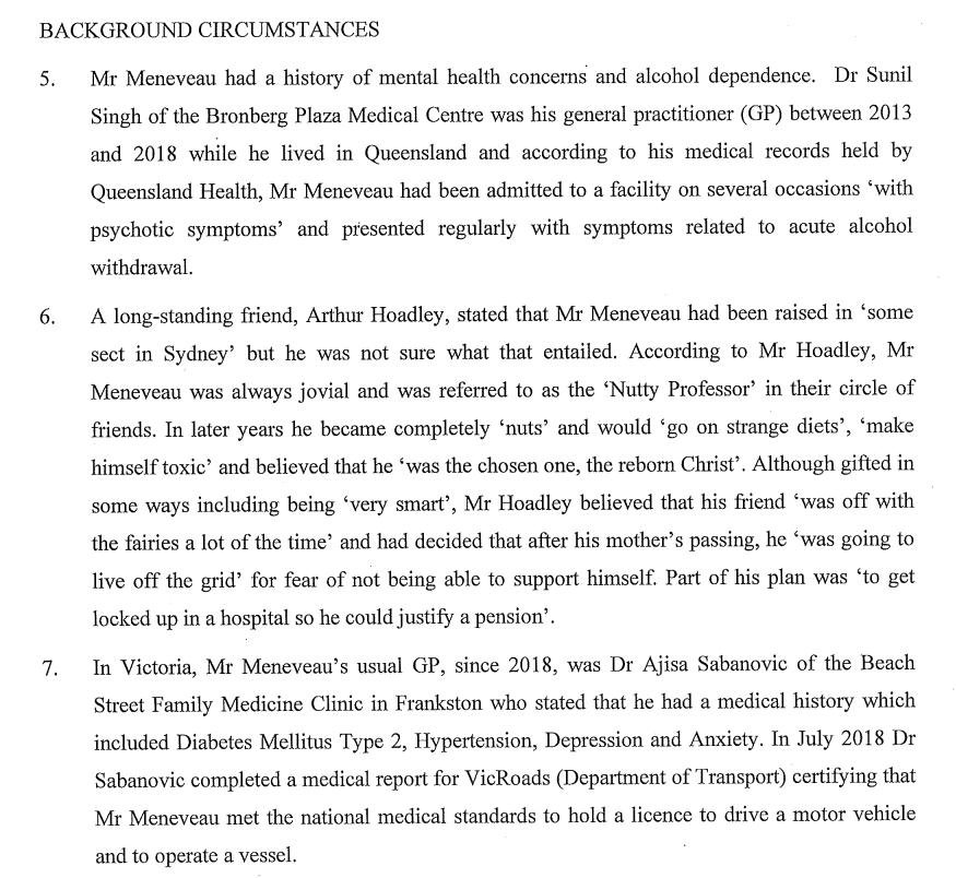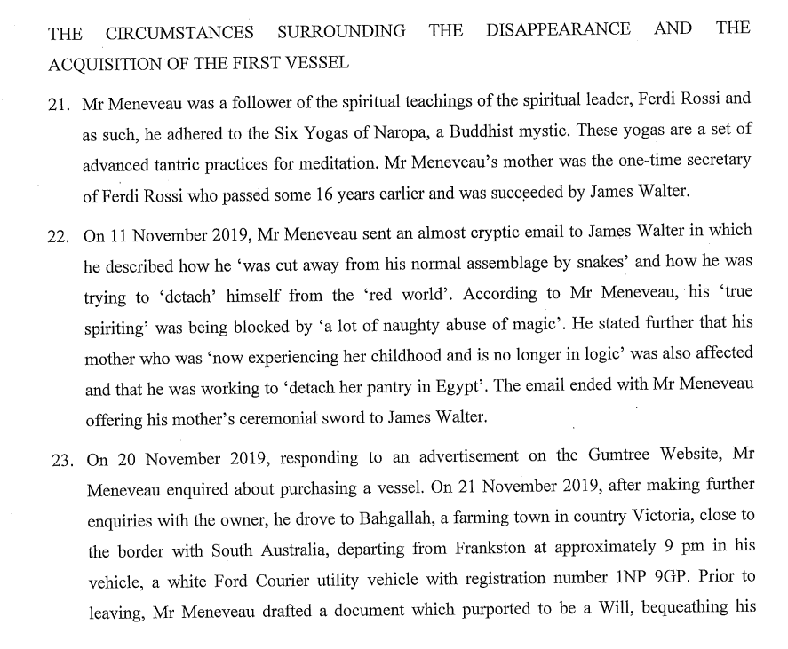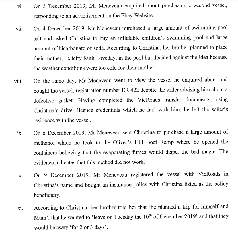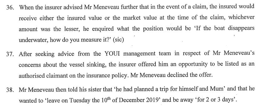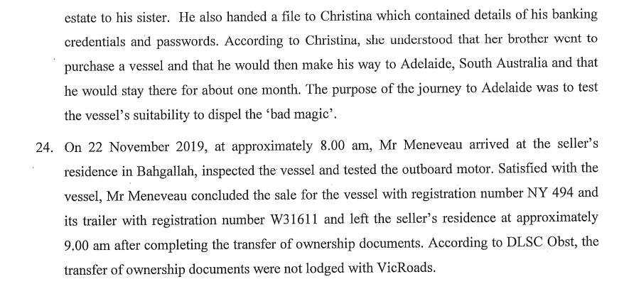 Mr Meneveau bought a boat, which he registered and insured in his sister's name. He gave his sister Christina his online passwords, banking credentials and a document appearing to be a will, leaving his estate to her.