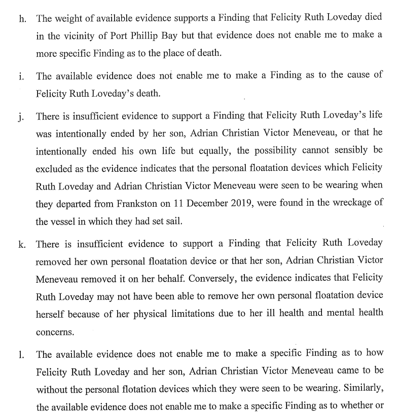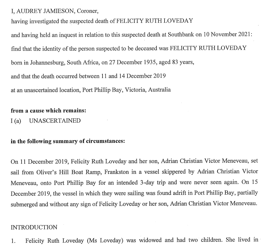 “For me it was the significant delay in the report, it was Felicity being 83 years old and frail and believing that she was going to be OK on a vessel for three days on Port Phillip Bay,” he said, describing the boat as a lake fishing vessel at best.