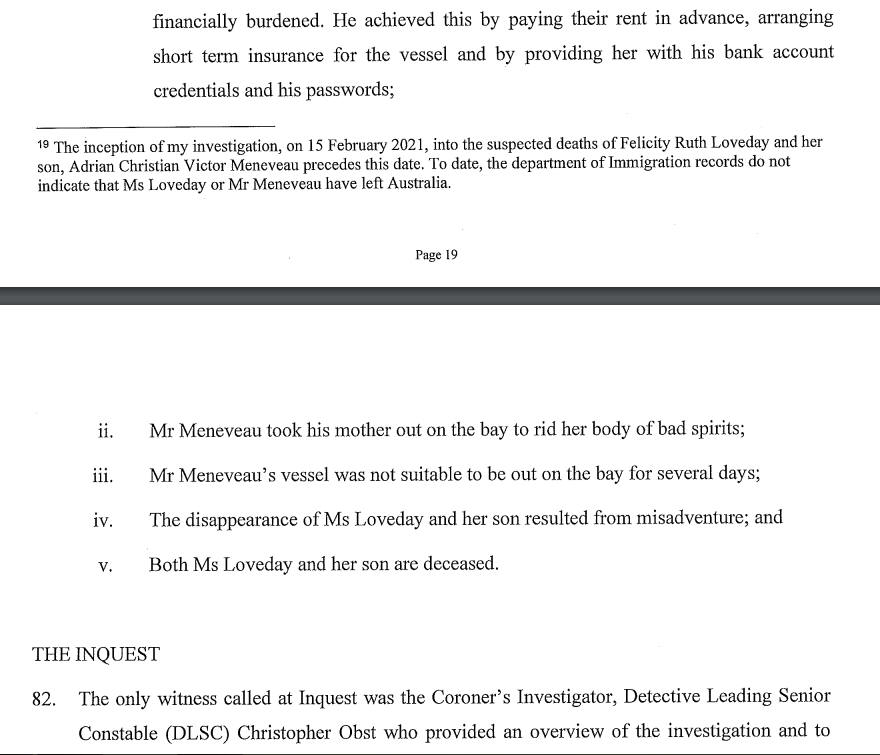 The Frankston mother and son were into sorcery and investigators were told Ms Loveday believed she had evoked a harmful presence and that the only way to get rid of it was to venture out to sea. Ms Loveday was born in South Africa and had practised spiritual rituals most of her life.