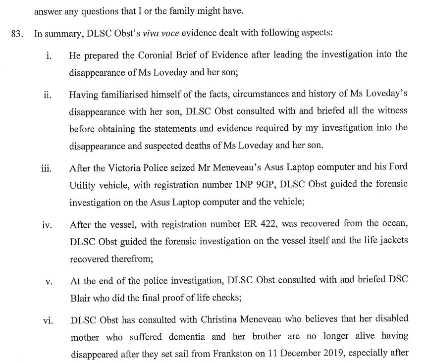 Det Obst said Ms Meneveau had been very "matter of fact" and "philosophical" about her family's disappearance and believed they had died.