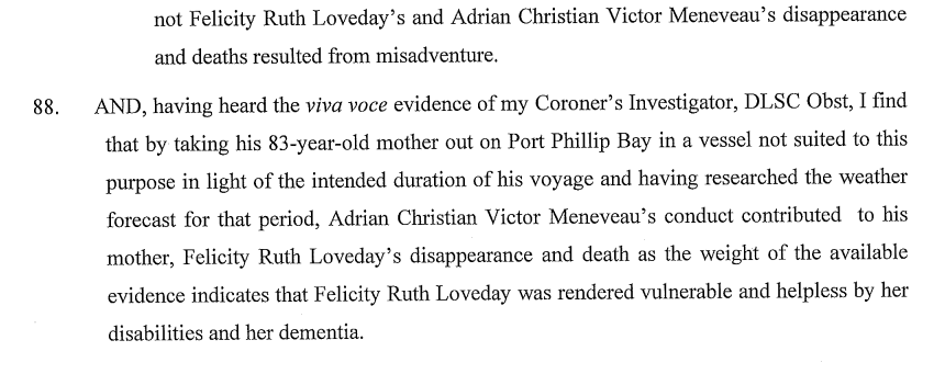 "For me it was the significant delay in the report, it was Felicity being 83 years old and frail, and believing that she was going to be OK on a vessel for three days on Port Phillip Bay," he said, describing the boat as a lake fishing vessel at best.