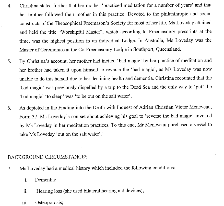The inquest has heard Meneveau believed his mother had incited bad magic by practising her spiritual beliefs and it could only be dispelled with salt water.