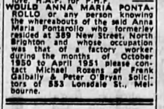 In 1954 Anna Maria Pontarollo disappeared. She was 28 years old. she had been living in North Brighton, Melbourne, Victoria.