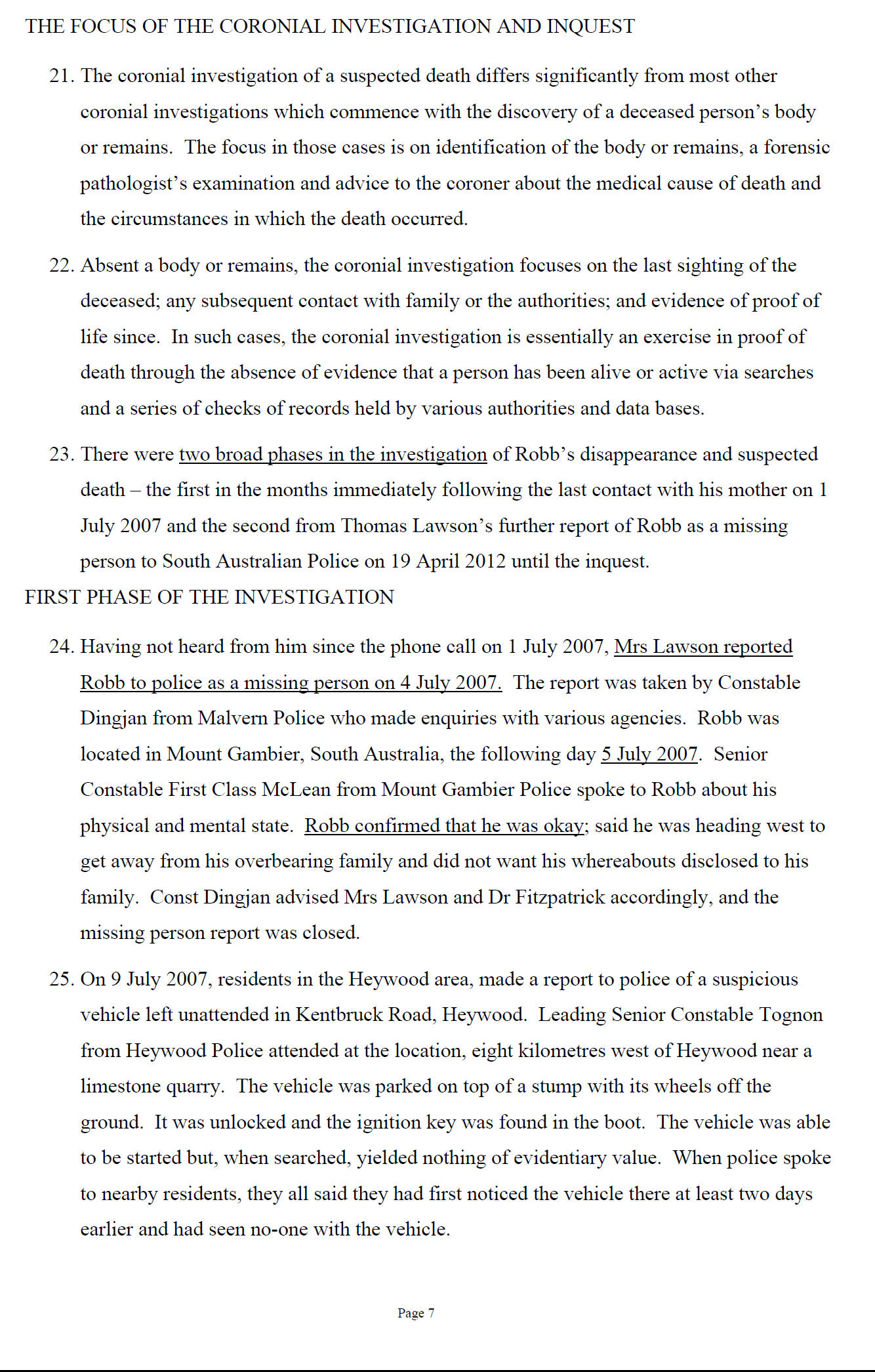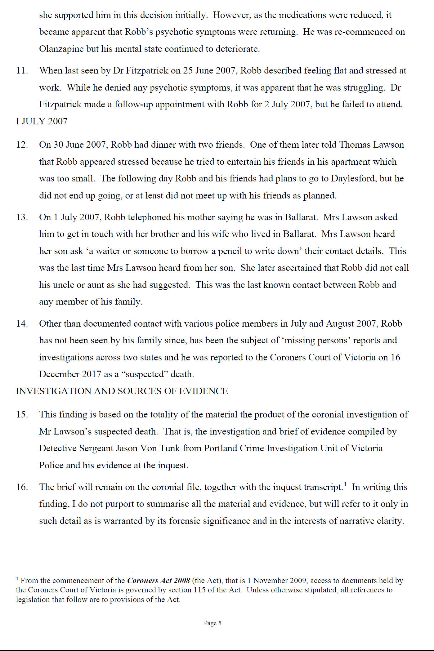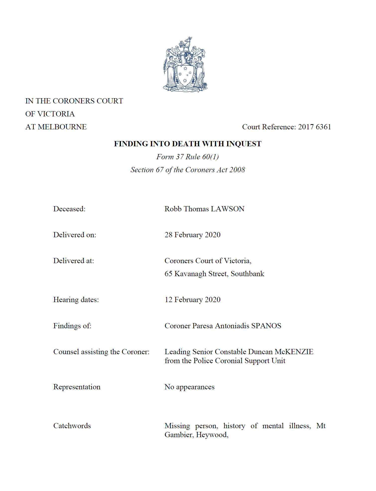 to the Coroner's Court that the circumstances of Mr Lawson be considered by the Coroner and investigated as a suspected death.