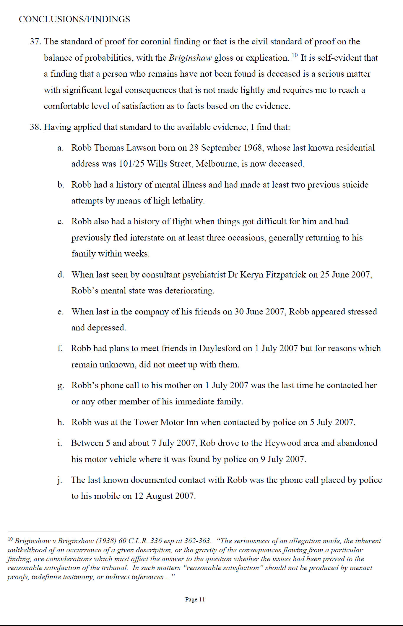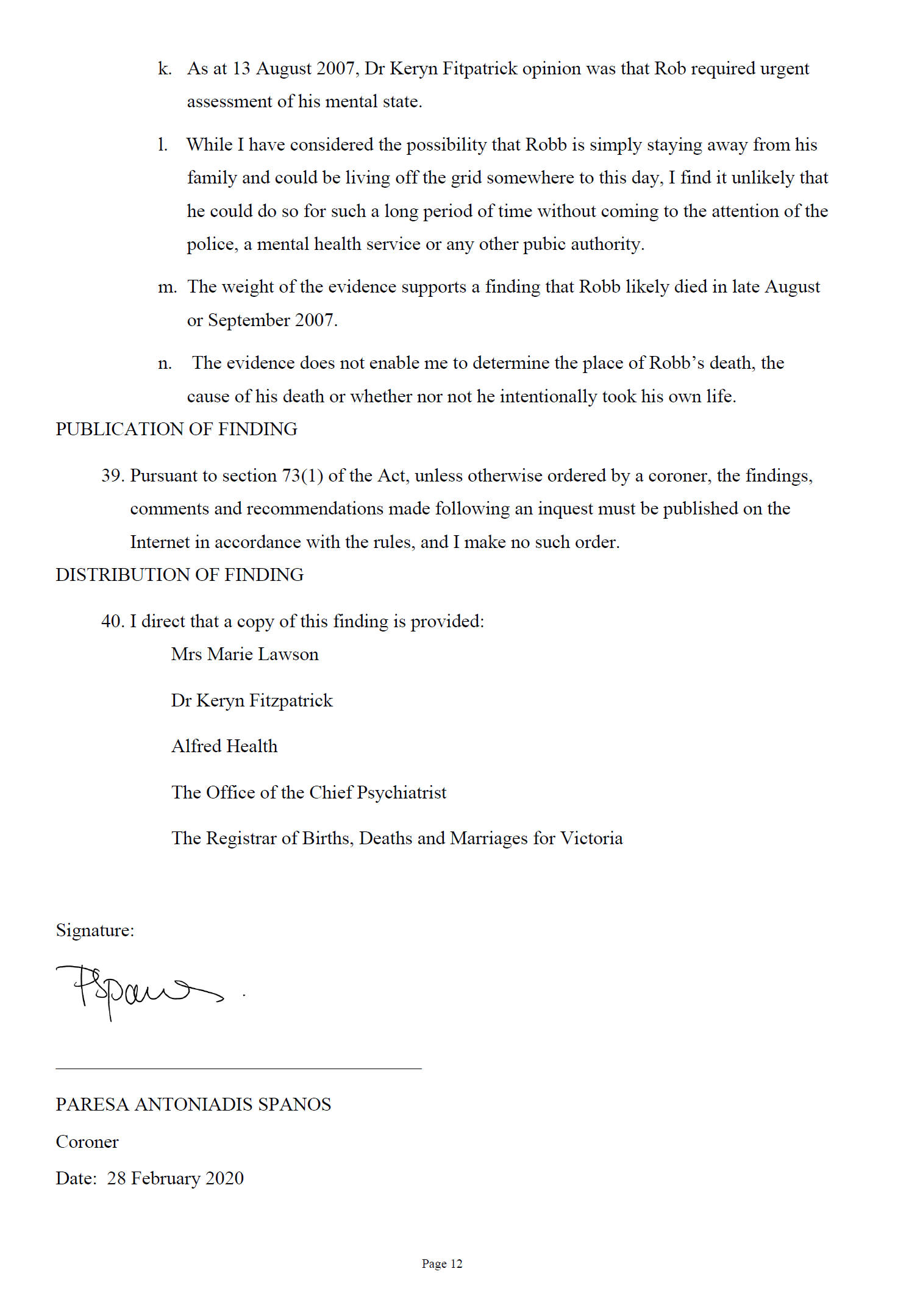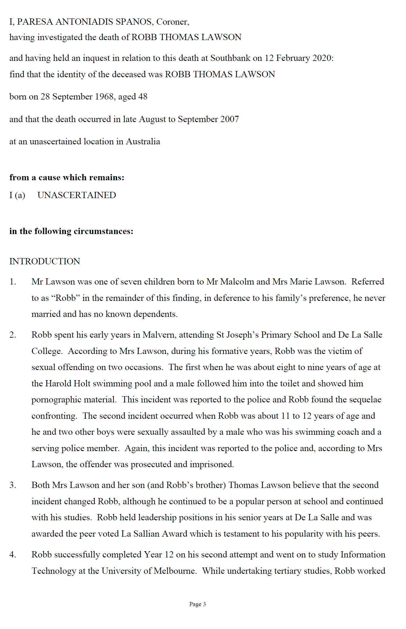 to the Coroner's Court that the circumstances of Mr Lawson be considered by the Coroner and investigated as a suspected death.