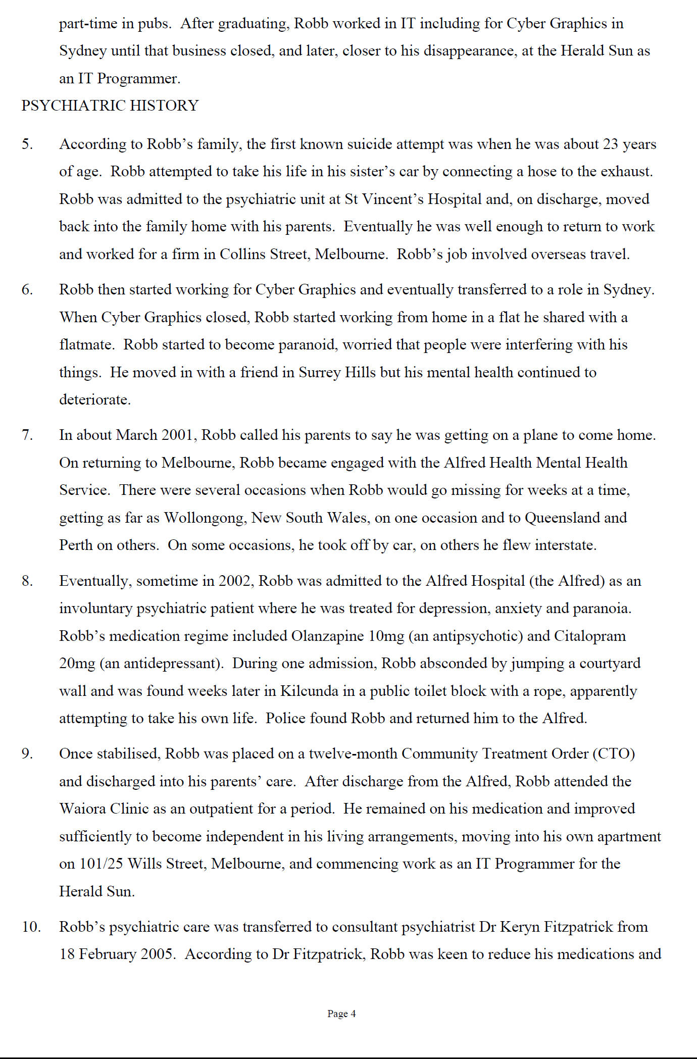 In June 2007 he told his psychiatrist Dr Keryn Fitzpatrick he was feeling flat and stressed at work and it was apparent he was struggling.