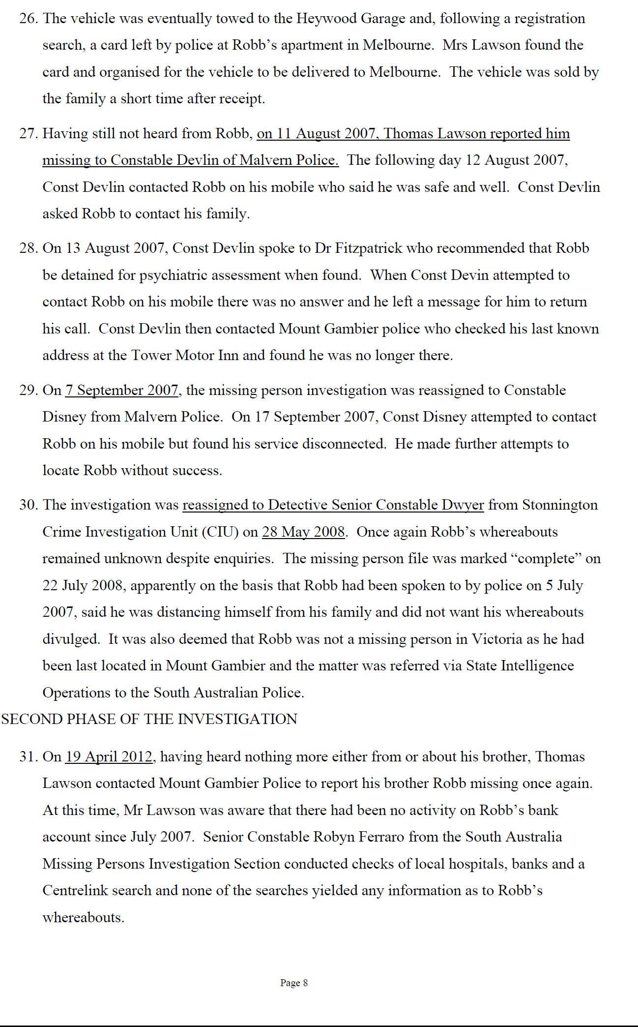 On April 19, 2012, the family contacted Mount Gambier Police to again formerly report Mr Lawson missing.