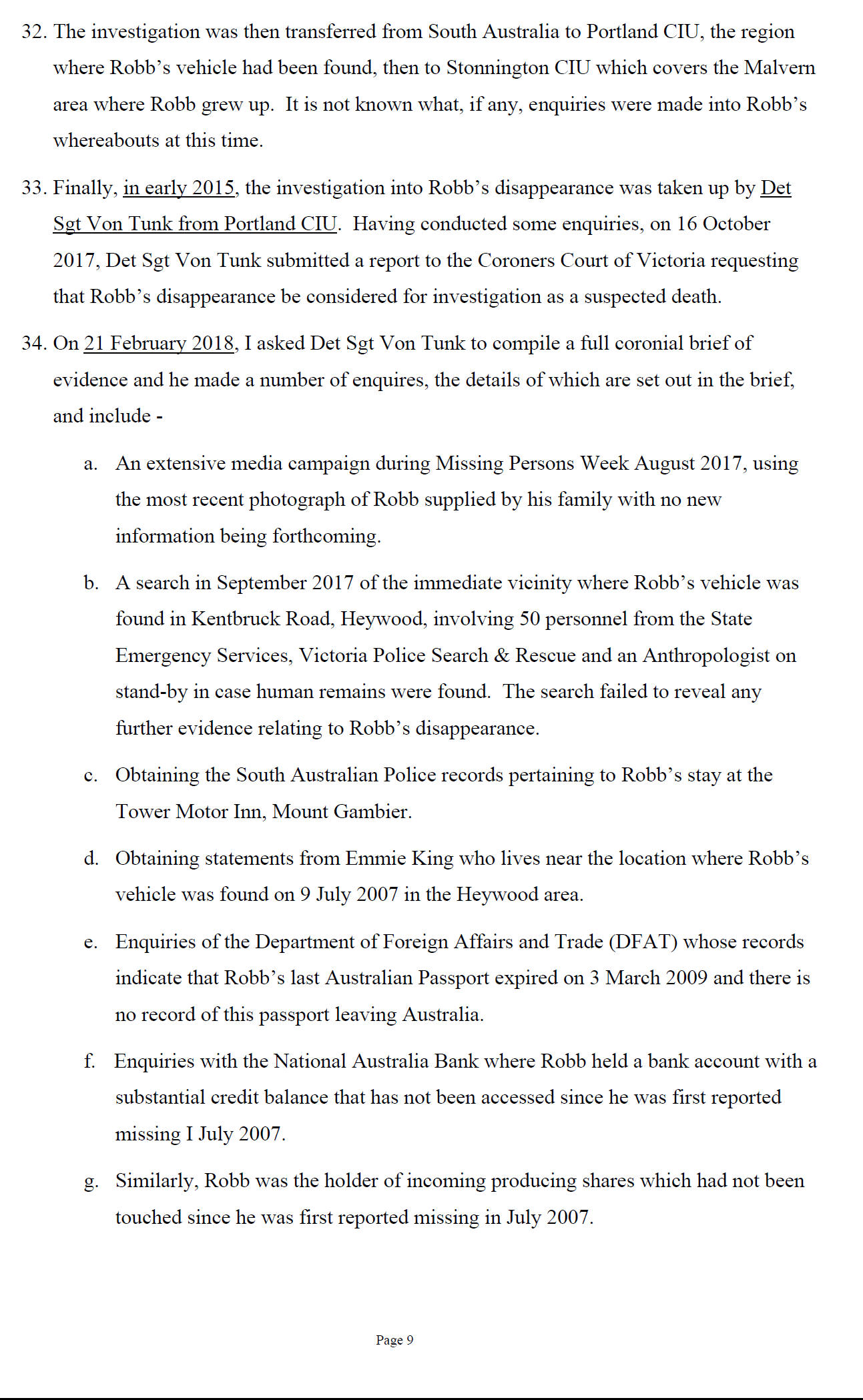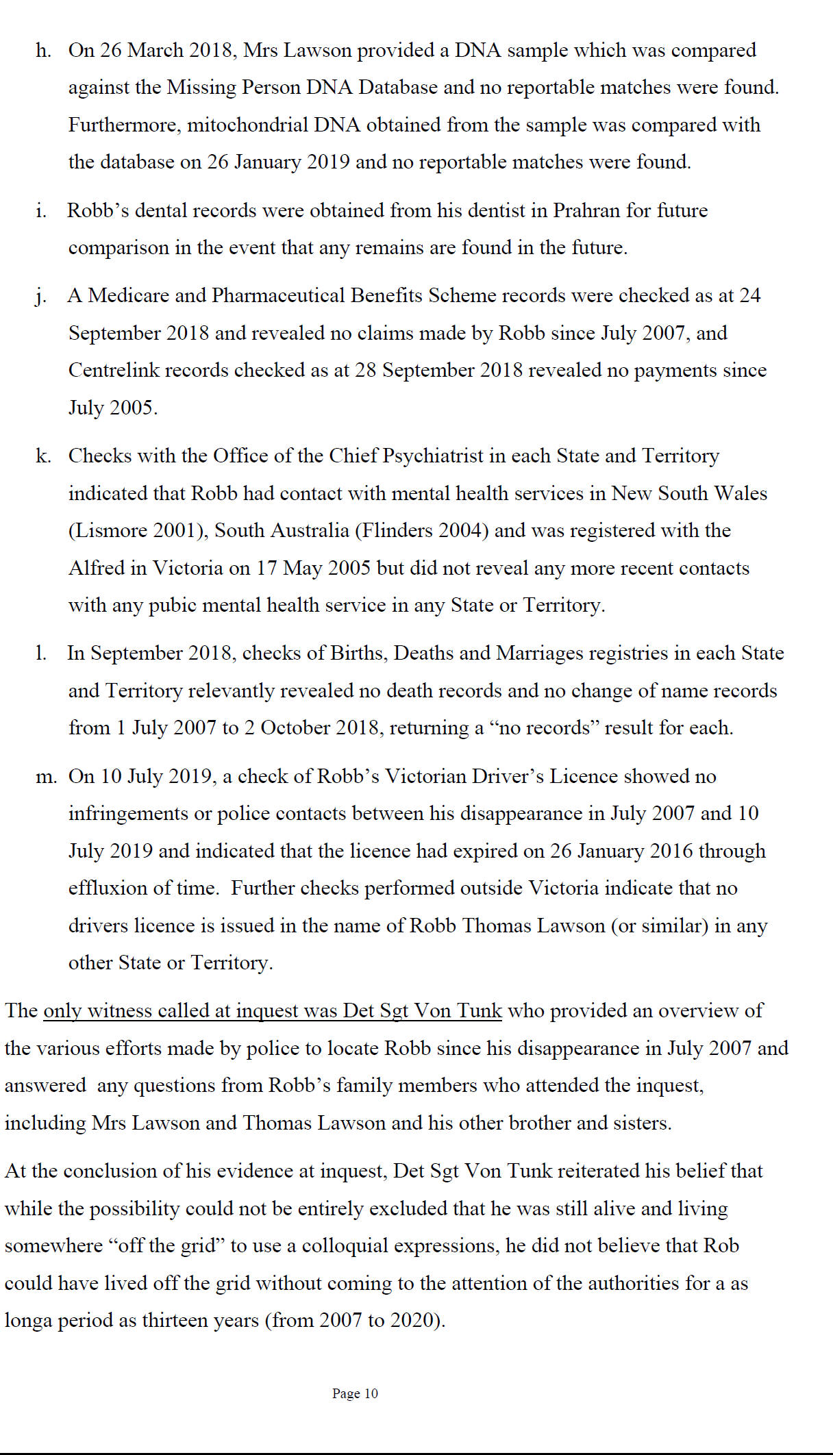 In September 2018, under the direction of the Coroner, the coronial investigator, Detective Sergeant Von Tunk commenced additional proof of life checks.