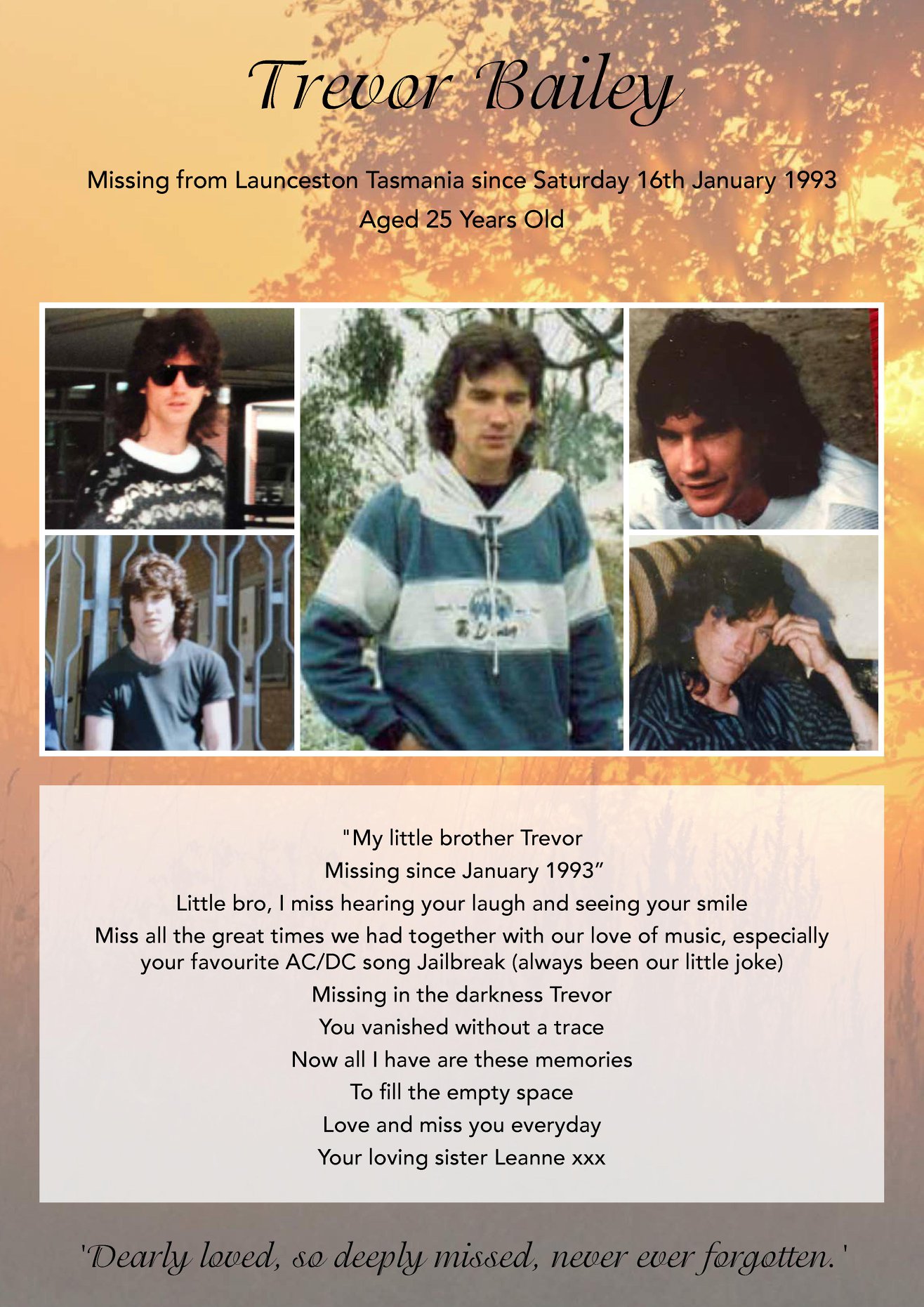 Trevor was last seen at Launceston Airport on 16 January 1993. He has not been