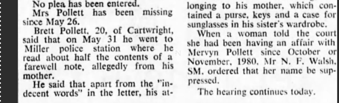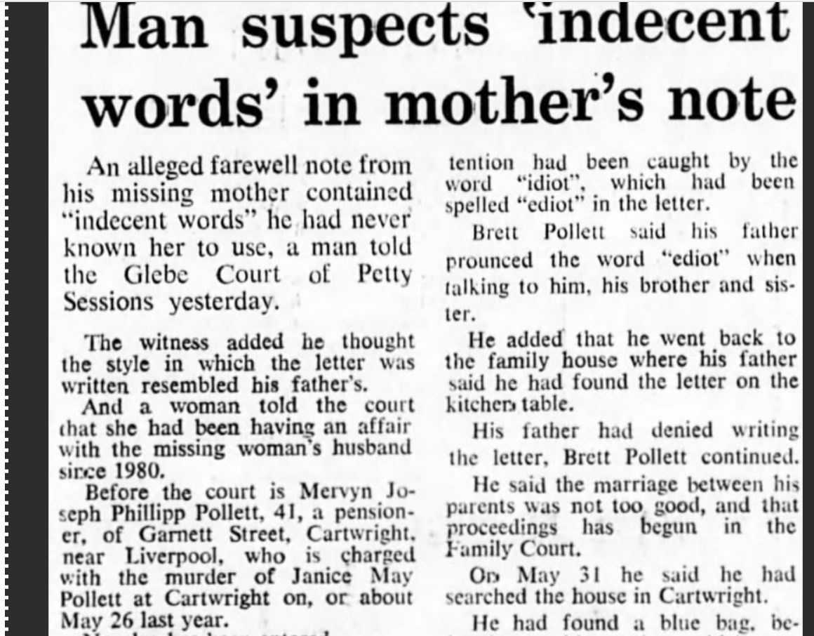 Janice Mary Pollett was 39 years of age at the time of her disappearance. Janice went missing from her home in Cartwright, Sydney, NSW on the 26th of May 1981. Her husband was later charged and convicted of her murder. Despite wide media coverage, Janice has not been located.