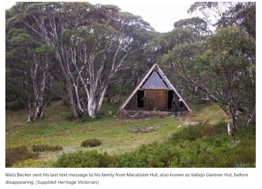 At about 9.32pm, Mr Becker sent his father, Peer Becker, a message confirming he’d arrived at Upper Jamieson Hut and planned to stay the night there.